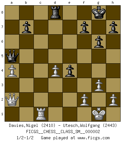 Last move : 1/2-1/2 2006 September 29 18:52:53 [Event "FICGS__CHESS__CLASS_SM__000002"] [Site "FICGS"] [Date "2006.09.01"] [Round "1"] [White "Davies,Nigel"] [Black "Utesch,Wolfgang"] [Result "1/2-1/2"] [WhiteElo "2410"] [BlackElo "2443"] 1.d4 Nf6 2.c4 e6 3.Nf3 d5 4.cxd5 exd5 5.Nc3 c6 6.Qc2 Be7 7.Bg5 g6 8.Bxf6 Bxf6 9.e3 Bf5 10.Bd3 Bxd3 11.Qxd3 Na6 12.a3 Nc7 13.b4 O-O 14.O-O a6 15.a4 Ne6 16.Rab1 Qe7 17.Rfc1 Rfd8 18.Qd2 Bg7 19.Ne1 Bh6 20.Ne2 Ng5 21.Ng3 Ne4 22.Nxe4 dxe4 23.Nc2 Rd5 24.Na3 Rad8 25.Qa2 a5 26.bxa5 c5 27.Nb5 cxd4 28.Nxd4 Rxd4 29.exd4 Bxc1 30.Rxc1 Qb4 31.g3 Qxa5 1/2-1/2 Queen's pawn game Kingside Castling by player Black (move 13) Kingside Castling by player White (move 14) This chess game ended in a draw. Follow this game move after move (download)Bobby Fischer is the greatest Chess genius of all time ! (Alexander Kotov) Alle Schachspieler sollten auch ein Hobby haben. (Savielly Grigorievitsch Tartakower) No hay precio que sea tan grande por la cabellera del Rey enemigo. (Koblentz) Le génie consiste à savoir transgresser les règles au moment opportun. (Teichmann) The arrogant army will lose certainly the battle. (Chinese proverb)