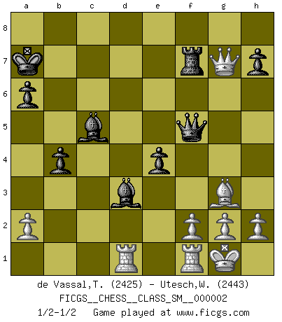 Last move : 1/2-1/2 2007 January 8 12:40:38 [Event "FICGS__CHESS__CLASS_SM__000002"] [Site "FICGS"] [Date "2006.09.01"] [Round "1"] [White "de Vassal,Thibault"] [Black "Utesch,Wolfgang"] [Result "1/2-1/2"] [WhiteElo "2425"] [BlackElo "2443"] 1.Nf3 Nf6 2.c4 e6 3.Nc3 d5 4.d4 c6 5.e3 Nbd7 6.Bd3 dxc4 7.Bxc4 b5 8.Bd3 Bb7 9.O-O a6 10.e4 c5 11.d5 c4 12.Bc2 Qc7 13.dxe6 fxe6 14.Nd4 Nc5 15.Be3 e5 16.Nf5 Nd3 17.Bg5 O-O-O 18.Qf3 Kb8 19.Rad1 b4 20.Nd5 Rxd5 21.exd5 e4 22.Qe2 Qe5 23.Bxf6 Qxf5 24.Bh4 Bc5 25.b3 Bxd5 26.bxc4 Bxc4 27.Bg3+ Ka7 28.Bxd3 Bxd3 29.Qb2 Rf8 30.Qxg7+ Rf7 1/2-1/2 Reti Opening Kingside Castling by player White (move 9) Queenside Castling by player Black (move 17) This chess game ended in a draw. Follow this game move after move (download)In order to improve your game, you must study the endgame before everything else, for whereas the endings can be studied and mastered by themselves, the middle game and the opening must be studied in relation to the endgame. (Jose Raul Capablanca) Wenn es im Universum noch irgendwo intelligente Lebewesen gibt, dann kennen sie Go. (Emanuel Lasker) Un entendimiento minucioso de las típicas continuaciones de mate hacen de las mas complicadas combinaciones de sacrificio que conducen hacia ellas no solo no dificiles, sino casi un asunto de rutina. (Siegbert Tarrasch) Il (Jacob Murray) ne joue pas pour le bon coup, mais pour le meilleur. (Eloi Relange) We need strong personalities and only one world champion to attract sponsors. (Anatoly Karpov)