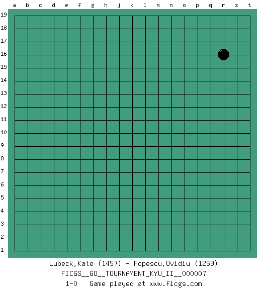 Last move : 1-0 2009 March 20 23:26:23 [Event "FICGS__GO__TOURNAMENT_KYU_II__000007"] [Site "FICGS"] [Date "2009.02.13"] [Round "1"] [Black "Lubeck,Kate"] [White "Popescu,Ovidiu"] [Result "1-0"] [Rating 1 "1457"] [Rating 2 "1259"] 1.r16 1-0 This go game has been lost on time (started : 2009.02.13 22:1:54) Here are the names of the openings (joseki) played in the four corners : Player Black won this Go (weiqi, baduk) game. Follow this game move after move (download)Keep away from thickness. (Anonymous) I'll be back. (Arnold Schwarzenegger)