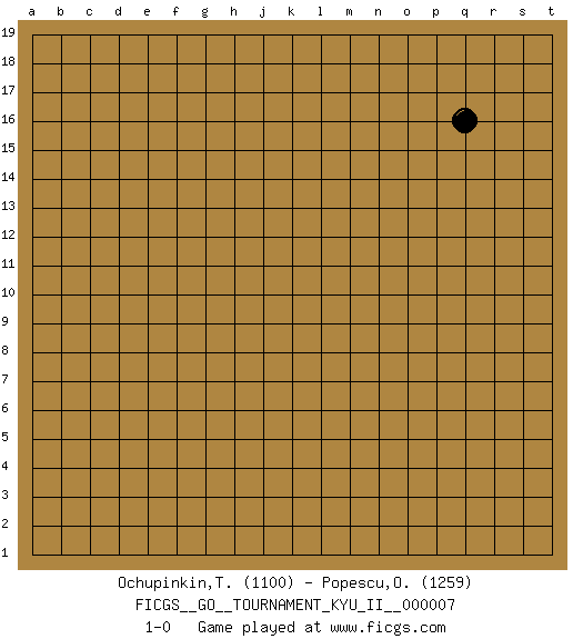 Last move : 1-0 2009 March 16 22:58:18 [Event "FICGS__GO__TOURNAMENT_KYU_II__000007"] [Site "FICGS"] [Date "2009.02.13"] [Round "1"] [Black "Ochupinkin,Teodor"] [White "Popescu,Ovidiu"] [Result "1-0"] [Rating 1 "1100"] [Rating 2 "1259"] 1.q16 1-0 This go game has been lost on time (started : 2009.02.13 22:1:54) Here are the names of the openings (joseki) played in the four corners : Player Black won this Go (weiqi, baduk) game. Follow this game move after move (download)Dead group ? Always win ko fights ! (Anonymous) Always be a first-rate version of yourself, instead of a second-rate version of somebody else. (Judy Garland)