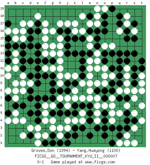 Last move : 0-1 2009 October 14 22:12:29 [Event "FICGS__GO__TOURNAMENT_KYU_II__000007"] [Site "FICGS"] [Date "2009.02.13"] [Round "1"] [Black "Groves,Don"] [White "Yang,Huayong"] [Result "0-1"] [Rating 1 "1394"] [Rating 2 "1100"] 1.r16 d17 2.q3 c4 3.o17 q5 4.r7 s5 5.o4 p6 6.k3 r9 7.p8 n6 8.n8 q8 9.q7 p7 10.q9 r8 11.p9 r11 12.d15 c15 13.c14 c16 14.d14 f17 15.d10 e3 16.c6 h3 17.k5 m3 18.m4 c8 19.d7 d9 20.e9 c10 21.d8 c9 22.e11 b7 23.r13 j17 24.b6 b12 25.c12 b13 26.c11 b11 27.b14 b4 28.a7 a8 29.a9 a6 30.a5 a10 31.q10 r10 32.q11 s7 33.a7 b8 34.l17 r17 35.q17 s16 36.j15 k16 37.k13 m7 38.h5 g4 39.s17 l16 40.m16 m15 41.l15 m17 42.n16 l18 43.k15 f6 44.g7 g6 45.g5 f5 46.n3 e12 47.f12 l9 48.l8 m8 49.m9 e8 50.e7 f8 51.f7 f9 52.e10 h7 53.h8 k8 54.l10 l7 55.j9 k10 56.k9 m10 57.l8 f11 58.f10 l9 59.l11 n9 60.r12 m11 61.l12 p12 62.o12 o11 63.p11 n12 64.o13 r18 65.s15 q16 66.r15 n17 67.m18 n18 68.o18 k17 69.o16 o19 70.p19 n19 71.q18 f15 72.d12 f13 73.e13 g13 74.e16 f16 75.j2 h2 76.h1 g1 77.j1 r2 78.r3 s3 79.q2 n13 80.e17 e18 81.g2 f2 82.f1 e1 83.g1 g3 84.a13 a16 85.a12 b9 86.n14 o14 87.p13 p14 88.q13 m14 89.n15 g11 90.m13 m12 91.l13 h10 92.g10 h9 93.j8 h11 94.g9 j3 95.k2 a4 96.s11 s1 97.s10 t9 98.s9 s8 99.s6 r6 100.h16 h17 101.g15 g14 102.d5 j7 103.d2 e2 104.e4 f4 105.h6 c2 106.k6 j10 107.g8 s12 108.t12 q1 109.p1 r1 110.o2 k7 111.e14 f14 112.d16 c17 113.o10 p4 114.o7 n5 115.o5 o6 116.g12 h12 117.e12 h14 118.j13 h13 119.p3 n4 120.m5 h15 121.j16 g16 122.r4 l5 123.l6 j6 124.j5 l4 125.m6 k4 126.l3 j4 127.m2 n11 128.n10 m9 129.o8 n7 130.a15 b15 131.a17 b16 132.s4 t4 133.r5 t6 134.a14 a11 135.j14 o9 136.c13 p10 137.q12 o10 138.e5 d3 139.e6 t10 140.s13 t8 141.t11 p5 142.o3 b5 0-1 Here are the names of the openings (joseki) played in the four corners : Corner q4 : q3 q5 Komoku (Somok, Xiao~mu`) 3-4 Point. The komoku (3-4) point is the traditional corner enclosure move.. Ikken Takagakari (Hankan Nop'dakeolch'im, Yi Gaogua`jiao~, 1-Space High Approach). The 5-4 approach move has become more popular in modern times, as modern Go emphasizes speed and influence. Corner d16 : d17 d15 Komoku (Somok, Xiao~mu`) 3-4 Point. The komoku (3-4) point is the traditional corner enclosure move.. Ikken Takagakari (Hankan Nop'dakeolch'im, Yi Gaogua`jiao~, 1-Space High Approach). The 5-4 approach move has become more popular in modern times, as modern Go emphasizes speed and influence. Player White won this Go (weiqi, baduk) game. Follow this game move after move (download)If a formation is symmetrical, play at the center. (Anonymous) A good aphorism is too hard for the tooth of time, and is not worn away with the centuries, although it serves as food for every speech. (Friedrich Nietzsche)
