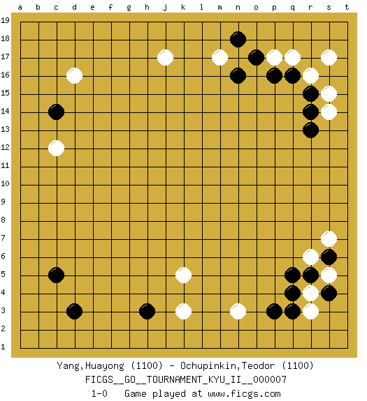 Last move : 1-0 2009 April 7 2:13:56 [Event "FICGS__GO__TOURNAMENT_KYU_II__000007 "] [Site "FICGS"] [Date "2009.02.13"] [Round "1"] [Black "Yang,Huayong "] [White "Ochupinkin,Teodor "] [Result "1-0"] [Rating 1 "1100"] [Rating 2 "1100"] 1.q4 d16 2.d3 r16 3.c5 k3 4.h3 n3 5.p3 k5 6.p16 p17 7.o17 q17 8.c14 c12 9.n16 m17 10.n18 j17 11.r15 s15 12.q16 s17 13.r14 s14 14.r13 r4 15.r5 r3 16.q3 s5 17.s6 r6 18.q5 s7 19.s4 1-0 This go game has been lost on time (started : 2009.02.13 22:1:54) Here are the names of the openings (joseki) played in the four corners : Corner q4 : q4 n3Hoshi (Hwajeom, Seongjeom, Xingwei`) 4-4 Point. The star or hoshi (4-4) point, emphasizing influence at the potential expense of territory.Nikken Kakari (Dukan Keolch'im, E`r Gua`jiao~, 2-Space Low Approach). Black typically answers by 7-3 or 3-5 (which is not joseki). Corner q16 : r16 p16Komoku (Somok, Xiao~mu`) 3-4 Point. The komoku (3-4) point is the traditional corner enclosure move..Ikken Takagakari (Hankan Nop'dakeolch'im, Yi Gaogua`jiao~, 1-Space High Approach). The 5-4 approach move has become more popular in modern times, as modern Go emphasizes speed and influence. Corner d16 : d16 c14Hoshi (Hwajeom, Seongjeom, Xingwei`) 4-4 Point. The star or hoshi (4-4) point, emphasizing influence at the potential expense of territory.Ikken Kakari (Hankan Keolch'im, Yi Gua`jiao~, 1-Space Low Approach). Black 2 is the standard approach move to the 4-4. Player Black won this Go (weiqi, baduk) game.Follow this game move after move (download ) Only amateurs try to come up with fancy moves. (Anonymous) If you lose the game you should win the analysis! (Proverb)