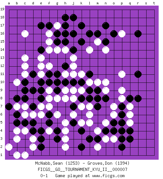 Last move : 0-1 2009 April 7 10:37:44 [Event "FICGS__GO__TOURNAMENT_KYU_II__000007"] [Site "FICGS"] [Date "2009.02.13"] [Round "1"] [Black "McNabb,Sean"] [White "Groves,Don"] [Result "0-1"] [Rating 1 "1253"] [Rating 2 "1394"] 1.r16 d3 2.q3 c16 3.e17 h16 4.e14 c13 5.k17 h14 6.h17 g17 7.g16 j17 8.h18 k16 9.j18 f16 10.g15 f15 11.h15 g14 12.j16 j15 13.h16 f14 14.f17 d8 15.k4 q5 16.r8 p8 17.p7 q7 18.q8 o7 19.p6 o6 20.p5 p9 21.r11 p4 22.o5 n5 23.o4 m4 24.p3 p16 25.n17 n16 26.m16 m15 27.l16 l14 28.d5 f4 29.c3 c4 30.d4 b3 31.c2 d2 32.c5 b4 33.b2 a2 34.e3 c1 35.e2 b1 36.e4 h4 37.j5 g6 38.j7 h8 39.k2 k9 40.j14 h2 41.m3 j13 42.k15 n3 43.n4 p11 44.b8 c7 45.b6 b7 46.a7 b10 47.c9 e6 48.c10 c11 49.d11 c12 50.e10 o3 51.q4 q6 52.p4 m2 53.l3 l5 54.p2 e13 55.g3 h3 56.g4 h5 57.f5 f9 58.f10 g10 59.n15 f12 60.e9 f8 61.e8 e7 62.d9 e11 63.f11 e12 64.g11 n14 65.o16 h11 66.g9 g8 67.h10 j9 68.h12 j11 69.j10 k11 70.k10 l10 71.l11 h9 72.g10 j12 73.l9 m10 74.l8 k7 75.k8 j8 76.f6 f7 77.k6 l7 78.m7 l6 79.n8 k5 80.d7 d6 81.c8 n10 82.d7 c6 83.b5 m8 84.m9 n9 85.m8 j6 0-1 Here are the names of the openings (joseki) played in the four corners : Corner d16 : c16 e17 Komoku (Somok, Xiao~mu`) 3-4 Point. The komoku (3-4) point is the traditional corner enclosure move.. Ikken Kakari (Hankan Keolch'im, Yi Gua`jiao~, 1-Space Low Pincer). The small knight move is the basic approach move to the 3-4 point stone. It has been continually used for over four centuries. There are limitless variations, with new moves constantly being discovered. Black 2 opens the door to a treaure store of joseki. Corner q4 : q3 q5 Komoku (Somok, Xiao~mu`) 3-4 Point. The komoku (3-4) point is the traditional corner enclosure move.. Ikken Takagakari (Hankan Nop'dakeolch'im, Yi Gaogua`jiao~, 1-Space High Approach). The 5-4 approach move has become more popular in modern times, as modern Go emphasizes speed and influence. Player White won this Go (weiqi, baduk) game. Follow this game move after move (download)The monkey jump is worth eight points. (Anonymous) To steal ideas from one person is plagiarism. To steal from many is research. (Unknown)