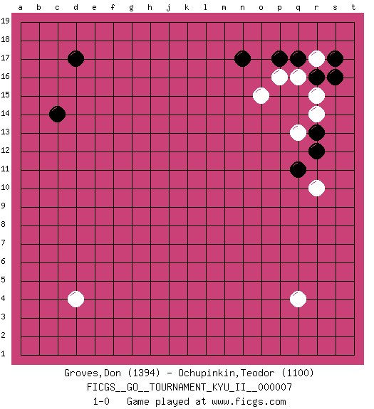 Last move : 1-0 2009 April 3 1:49:23 [Event "FICGS__GO__TOURNAMENT_KYU_II__000007"] [Site "FICGS"] [Date "2009.02.13"] [Round "1"] [Black "Groves,Don"] [White "Ochupinkin,Teodor"] [Result "1-0"] [Rating 1 "1394"] [Rating 2 "1100"] 1.r16 d4 2.d17 q4 3.c14 p16 4.n17 o15 5.r13 r17 6.q17 q16 7.p17 r15 8.s16 r14 9.s17 q13 10.r12 r10 11.q11 1-0 This go game has been lost on time (started : 2009.02.13 22:1:54) Here are the names of the openings (joseki) played in the four corners : Corner q16 : r16 p16 Komoku (Somok, Xiao~mu`) 3-4 Point. The komoku (3-4) point is the traditional corner enclosure move.. Ikken Takagakari (Hankan Nop'dakeolch'im, Yi Gaogua`jiao~, 1-Space High Approach). The 5-4 approach move has become more popular in modern times, as modern Go emphasizes speed and influence. Player Black won this Go (weiqi, baduk) game. Follow this game move after move (download)Add one stone, then sacrifice both. (Anonymous) Perception is reality. (Immanuel Kant)