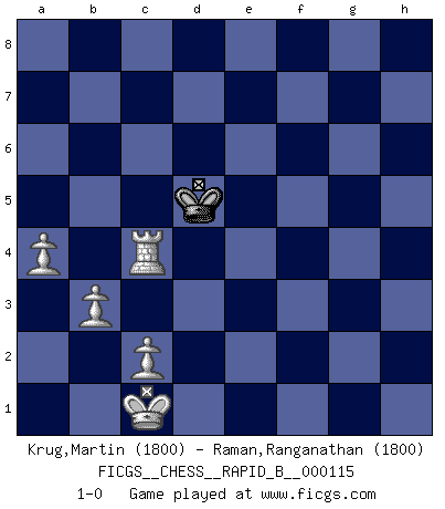 Last move : 1-0 2009 April 26 23:8:21 [Event "FICGS__CHESS__RAPID_B__000115"] [Site "FICGS"] [Date "2009.02.14"] [Round "1"] [White "Krug,Martin"] [Black "Raman,Ranganathan"] [Result "1-0"] [WhiteElo "1800"] [BlackElo "1800"] 1.e4 e5 2.Bc4 Qf6 3.Nc3 c6 4.d3 Bc5 5.Qe2 b5 6.Bb3 a5 7.a4 b4 8.Nb1 h5 9.Be3 d6 10.Bxc5 dxc5 11.Nd2 Ne7 12.Nc4 Nd7 13.Qf3 Qxf3 14.Nxf3 O-O 15.Nfxe5 Ra7 16.f4 Nf6 17.Nd6 Be6 18.O-O-O Ng4 19.Bxe6 fxe6 20.Nxg4 hxg4 21.g3 Rd8 22.Nc4 Nc8 23.Ne5 Nb6 24.Nxc6 R8d7 25.Nxa7 Rxa7 26.b3 g6 27.h3 gxh3 28.Rxh3 Nd7 29.Rdh1 Nf8 30.Rh8+ Kg7 31.g4 Rf7 32.f5 exf5 33.gxf5 gxf5 34.R8h5 fxe4 35.dxe4 Ng6 36.Rxc5 Rf4 37.e5 Rf5 38.Rxa5 Nxe5 39.Rb5 Kf6 40.Rxb4 Nc6 41.Rb6 Rc5 42.Rh6+ Ke5 43.Rbxc6 Rxc6 44.Rxc6 Kd5 45.Rc4 1-0 Bishop's Opening Kingside Castling by player Black (move 14) Queenside Castling by player White (move 18) 10 pieces endgame at move 38 : White KRRPPP , Black KRNP WHITE : King + 2 Rooks 3 Pawns BLACK : King + 1 Rook 1 Knight 1 Pawn 9 pieces endgame at move 40 : White KRRPPP , Black KRN WHITE : King + 2 Rooks 3 Pawns BLACK : King + 1 Rook 1 Knight 8 pieces endgame at move 43 : White KRRPPP , Black KR WHITE : King + 2 Rooks 3 Pawns BLACK : King + 1 Rook 7 pieces endgame at move 43 : White KRPPP , Black KR WHITE : King + 1 Rook 3 Pawns BLACK : King + 1 Rook 6 pieces endgame at move 44 : White KRPPP , Black K WHITE : King + 1 Rook 3 Pawns BLACK : King + Player White won this chess game. Follow this game move after move (download)Do you realize Fischer almost never has any bad pieces? He exchanges them, and the bad pieces remain with his opponents. (Yuri Balashov) Es war undenkbar für die Behörden, dass ein sowjetischer Großmeister auf diese Art und Weise [Fischer-Taimanov 6:0] verliert, ohne dass es eine politischer Erklärung dafür gäbe. (Mark Taimanov) Cualquier cambio de material en una posición debe venir por medio de un mate, una captura o promoción de Peón. (Purdy) Les Cavaliers se révèlent fort utiles dans les positions fermées. D'habitude, les Fous sont un peu plus forts que les Cavaliers dans les positions ouvertes. Qu'on le veuille ou non, il restera toujours des exceptions ! Remember : Your focus determines your reality. (Qui-Gon Jinn in Star Wars ep.1)
