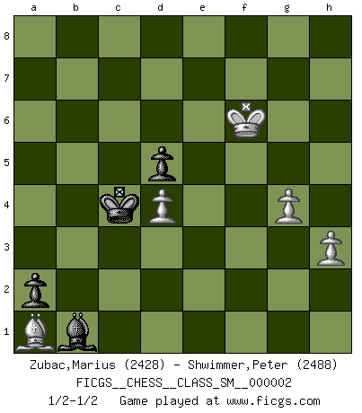 Last move : 1/2-1/2 2007 April 16 18:16:22 [Event "FICGS__CHESS__CLASS_SM__000002"] [Site "FICGS"] [Date "2006.09.01"] [Round "1"] [White "Zubac,Marius"] [Black "Shwimmer,Peter"] [Result "1/2-1/2"] [WhiteElo "2428"] [BlackElo "2488"] 1.d4 Nf6 2.c4 e5 3.dxe5 Ng4 4.Bf4 Nc6 5.Nf3 Bb4+ 6.Nc3 Bxc3+ 7.bxc3 Qe7 8.Qd5 f6 9.exf6 Nxf6 10.Qd3 d6 11.g3 O-O 12.Bg2 Kh8 13.O-O Bg4 14.Rfb1 Ne4 15.Qe3 Rae8 16.Nd4 Nxd4 17.cxd4 g5 18.Qxe4 Qxe4 19.Bxe4 Rxe4 20.Bxg5 Rxe2 21.Be3 Bf3 22.Re1 Kg7 23.Rxe2 Bxe2 24.Rc1 Kg6 25.h3 Bf3 26.Rc3 Re8 27.Kh2 h5 28.Bf4 Be4 29.Re3 Bc6 30.Rxe8 Bxe8 31.c5 Kf5 32.cxd6 cxd6 33.f3 Ke6 34.g4 b5 35.Kg3 b4 36.Kh4 hxg4 37.fxg4 Bg6 38.Kg5 Bb1 39.Bd2 a5 40.a3 bxa3 41.Bxa5 Kd5 42.Bb4 a2 43.Bc3 Kc4 44.Ba1 d5 45.Kf6 1/2-1/2 Budapest : Rubinstein variation Kingside Castling by player Black (move 11) Kingside Castling by player White (move 13) 10 pieces endgame at move 40 : White KBPPP , Black KBPPP WHITE : King + 1 Bishop 3 Pawns BLACK : King + 1 Bishop 3 Pawns 9 pieces endgame at move 41 : White KBPPP , Black KBPP WHITE : King + 1 Bishop 3 Pawns BLACK : King + 1 Bishop 2 Pawns This chess game ended in a draw. Follow this game move after move (download)The hardest game to win is a won game. (Emanuel Lasker) Privat ist Kortschnoi kein schlechter Mensch, sehr sympathisch. Aber während des Spiels ist er grausam. Er will dich töten. (Miguel Najdorf) Una victoria por una combinación errónea, aunque sea espectacular, me llena de horror artístico. (Wilhelm Steinitz) Les échecs sont un jeu terrible. Si vous n'avez pas le centre, votre adversaire a une position plus libre. Par contre, si vous avez le centre, alors vous avez vraiment quelque chose pour laquelle vous inquiéter ! (Siegbert Tarrasch) In theory there is no difference between theory and practice. In practice there is. (Yogi Berra)