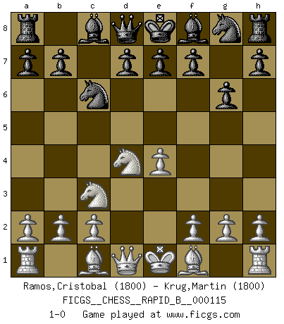 Last move : 1-0 2009 April 8 2:17:13 [Event "FICGS__CHESS__RAPID_B__000115"] [Site "FICGS"] [Date "2009.02.14"] [Round "1"] [White "Ramos,Cristobal"] [Black "Krug,Martin"] [Result "1-0"] [WhiteElo "1800"] [BlackElo "1800"] 1.e4 c5 2.Nf3 Nc6 3.d4 cxd4 4.Nxd4 g6 5.Nc3 1-0 This chess game has been lost on time (started : 2009.02.14 13:9:47) Sicilian : Accelerated Fianchetto, Modern variation Player White won this chess game. Follow this game move after move (download)It is the aim of the modern school, not to treat every position according to one general law, but according to the principle inherent in the position. (Richard Reti) Im Leben werden Partien nie so unstrittig gewonnen wie im Spiel (Emanuel Lasker) Te sientas frente a un tablero y repentinamente tu corazón brinca. Tu mano tiembla al tomar una pieza y moverla. Pero lo que el Ajedrez te enseña es que tu debes permanecer ahí con calma y pensar de que si realmente es una buena idea o de que si hay otras ideas mejores. (Stanley Kubrick) Psychologiquement, tu dois avoir confiance en toi même, mais cette confiance doit être basée sur des faits. (Robert Fischer) Perhaps chess is the wrong game for the times (The Chess Master and the Computer, by Garry Kasparov - 2010)