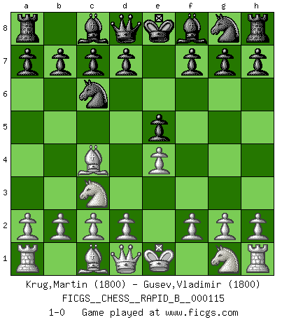 Last move : 1-0 2009 March 22 23:40:0 [Event "FICGS__CHESS__RAPID_B__000115"] [Site "FICGS"] [Date "2009.02.14"] [Round "1"] [White "Krug,Martin"] [Black "Gusev,Vladimir"] [Result "1-0"] [WhiteElo "1800"] [BlackElo "1800"] 1.e4 e5 2.Bc4 Nc6 3.Nc3 1-0 This chess game has been lost on time (started : 2009.02.14 13:9:47) Bishop's Opening Player White won this chess game. Follow this game move after move (download)We don't really know how the game was invented, though there are suspicions. As soon as we discover the culprits, we'll let you know. (Bruce Pandolfini) Die jungen Leute sollen verstehen, dass sie noch etwas von mir lernen können und müssen. (Viktor Kortschnoi) Morphy probablemente fue el genio más grande de todos. (Bobby Fischer) Il vaut toujours mieux jouer un plan faux de façon logique que de n'avoir pas de plan du tout. (Victor Kortchnoï) There is a computer disease that anybody who works with computers knows about. It's a very serious disease and it interferes completely with the work. The trouble with computers is that you 'play' with them ! (Richard P. Feynman)