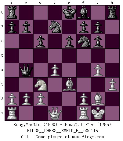 Last move : 0-1 2009 April 5 14:10:15 [Event "FICGS__CHESS__RAPID_B__000115"] [Site "FICGS"] [Date "2009.02.14"] [Round "1"] [White "Krug,Martin"] [Black "Faust,Dieter"] [Result "0-1"] [WhiteElo "1800"] [BlackElo "1785"] 1.e4 d5 2.exd5 Qxd5 3.Nc3 Qd6 4.d4 Nf6 5.Nf3 Bg4 6.h3 Bh5 7.g4 Bg6 8.Ne5 Nbd7 9.Nxg6 hxg6 10.Bg2 c6 11.Be3 Qb4 12.O-O e6 0-1 This chess game has been lost on time (started : 2009.02.14 13:9:47) Scandinavian : Pytel-Wade variation Kingside Castling by player White (move 12) Player Black won this chess game. Follow this game move after move (download)After black's reply to 1.e4 with 1..e5, leaves him always trying to get into the game. (Howard Staunton) Der beste Spieler in einem Turnier gewinnt es nie. Er landet auf Platz zwei oder drei. (Siegbert Tarrasch) Buenas posiciones no logran ganar juegos, buenas movidas sí. (Gerald Abrahams) Les échecs, c'est l'imagination. (David Bronstein) The problem with troubleshooting is that trouble shoots back. (Anonymous)