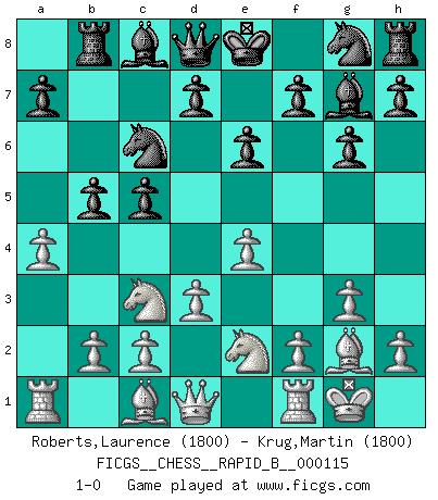 Last move : 1-0 2009 April 2 13:48:7 [Event "FICGS__CHESS__RAPID_B__000115"] [Site "FICGS"] [Date "2009.02.14"] [Round "1"] [White "Roberts,Laurence"] [Black "Krug,Martin"] [Result "1-0"] [WhiteElo "1800"] [BlackElo "1800"] 1.e4 c5 2.Ne2 Nc6 3.Nbc3 g6 4.g3 Bg7 5.Bg2 Rb8 6.O-O b5 7.d3 e6 8.a4 1-0 This chess game has been lost on time (started : 2009.02.14 13:9:47) Sicilian : Keres variation (2.Ne2) Kingside Castling by player White (move 6) Player White won this chess game. Follow this game move after move (download)Man is a frivolous, a specious creature, and like a Chess player, cares more for the process of attaining his goal than for the goal itself. (Dostoyevsky) Wenn du auf das Glück wartest, wird das Leben ziemlich langweilig. (Mikhail Nekhemyevich Tal) De eso se trata el Ajedrez. Un día le das una lección a tu oponente y al día siguiente el te da una a tí. (Bobby Fischer) En blitz, le Cavalier l'emporte sur le Fou. (Vlastimil Hort) For peace of mind, resign as general manager of the universe. (Douglas Adams)