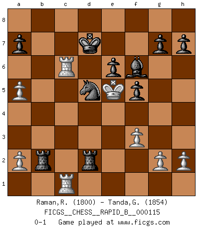 Last move : 0-1 2009 April 22 8:53:53 [Event "FICGS__CHESS__RAPID_B__000115"] [Site "FICGS"] [Date "2009.02.14"] [Round "1"] [White "Raman,Ranganathan"] [Black "Tanda,Giovanni"] [Result "0-1"] [WhiteElo "1800"] [BlackElo "1854"] 1.c4 c6 2.e4 d5 3.Qb3 dxe4 4.Nc3 Nf6 5.c5 Nbd7 6.Bc4 e6 7.d4 exd3 8.Na4 b5 9.Bxd3 bxa4 10.Qxa4 Nxc5 11.Qd1 Qxd3 12.Bd2 Qe4+ 13.Kf1 Ba6+ 14.Ne2 Rd8 15.f3 Qxe2+ 16.Qxe2 Bxe2+ 17.Kxe2 Be7 18.Ba5 Rd5 19.b4 Nb7 20.Rhc1 Kd7 21.Rc4 Nxa5 22.bxa5 Rb8 23.Rac1 Rb2+ 24.Ke3 R5d2 25.Rxc6 Nd5+ 26.Ke4 f5+ 27.Ke5 Bf6+ 0-1 English : Caro-Kann defensive system Player Black won this chess game. Follow this game move after move (download)The isolated Pawn casts gloom over the entire chessboard. (Aaron Nimzovich) Ich hatte Angst gegen einen russischen Großmeister zu verlieren, und er befürchtete gegen einen kleinen Jungen zu verlieren. (über ein Remis gegen Juri Awerbach). (Robert James Fischer) El Ajedrez es despiadado: debes de estar preparado para matar gente. (Nigel Short) Des combinaisons [dans le jeu d'échecs] pareilles à des mélodies. Je crois entendre pour ainsi dire la musique des coups... (Vladimir Nabokov) The various flowers seem good to different people. (Chinese proverb)