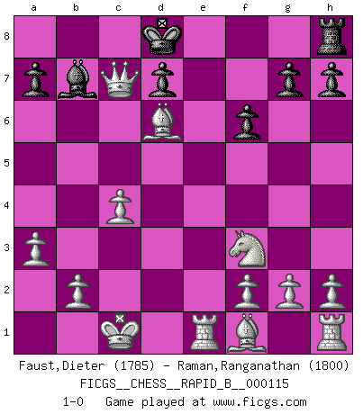 Last move : 1-0 2009 March 30 10:8:2 [Event "FICGS__CHESS__RAPID_B__000115"] [Site "FICGS"] [Date "2009.02.14"] [Round "1"] [White "Faust,Dieter"] [Black "Raman,Ranganathan"] [Result "1-0"] [WhiteElo "1785"] [BlackElo "1800"] 1.c4 e5 2.Nc3 c6 3.d4 Qf6 4.Nf3 exd4 5.Bg5 Qe6 6.Qxd4 c5 7.Qd2 f6 8.Bf4 Na6 9.O-O-O Ne7 10.e4 Nb4 11.a3 Nbc6 12.Nb5 Qxe4 13.Nd6+ Kd8 14.Nxb7+ Ke8 15.Nd6+ Kd8 16.Nxe4 Nf5 17.Qd5 Be7 18.Qxc6 Rb8 19.Bxb8 Nd6 20.Bc7+ Ke8 21.Nxd6+ Kf8 22.Qd5 Bxd6 23.Bxd6+ Ke8 24.Re1+ Kd8 25.Qxc5 Bb7 26.Qc7+ 1-0 English Opening Queenside Castling by player White (move 9) Player White won this chess game. Follow this game move after move (download)The passed pawn is a criminal, who should be kept under lock and key. Mild measures, such as police surveillance, are not sufficient. (Nimzovitch) Ich habe kein Problem mit Frauen, sondern nur mit dem Niveau ihres Schachspiels (Judith Polgar) Creo que una cierta cantidad de temperamento es esperada de los genios del Ajedrez. (Ron Gross) La victoire dans une partie d'Echecs appartient la plupart du temps à celui qui voit un peu plus loin que l'adversaire. (Lasker) You lose, general Kenobi. (General Grievous in Star Wars ep.3)