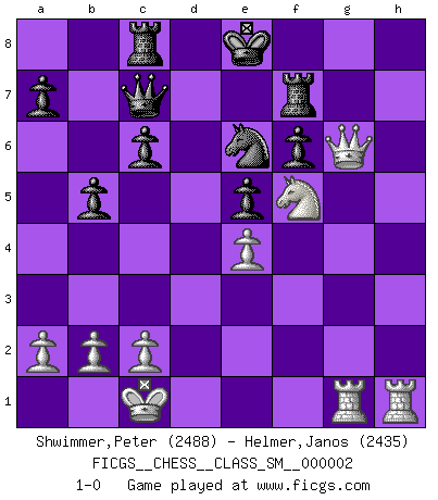 Last move : 1-0 2006 November 26 17:54:22 [Event "FICGS__CHESS__CLASS_SM__000002"] [Site "FICGS"] [Date "2006.09.01"] [Round "1"] [White "Shwimmer,Peter"] [Black "Helmer,Janos"] [Result "1-0"] [WhiteElo "2488"] [BlackElo "2435"] 1.d4 Nf6 2.f3 g6 3.e4 d6 4.Be3 Bg7 5.Nc3 c6 6.Qd2 O-O 7.O-O-O b5 8.g4 Nbd7 9.h4 h5 10.Nce2 hxg4 11.Ng3 gxf3 12.h5 Nxh5 13.Nxh5 gxh5 14.Bh6 f6 15.Nxf3 Rf7 16.Bh3 Nf8 17.Rdg1 Qc7 18.Bxc8 Rxc8 19.Qh2 e5 20.Qxh5 Ne6 21.Nh4 Kf8 22.Nf5 Bxh6+ 23.Qxh6+ Ke8 24.dxe5 dxe5 25.Qg6 1-0 Paleface attack Kingside Castling by player Black (move 6) Queenside Castling by player White (move 7) Player White won this chess game. Follow this game move after move (download)Without error there can be no brilliancy. (Emanuel Lasker) Das Schachspiel ist ein See, in welchem eine Mücke baden und ein Elefant ertrinken kann. (Emanuel Lasker) Solo los afeminados hacen el Enroque. (Rob Sillars) Le plus grand jeu de l'esprit jamais inventé, plus vous l'apprenez, plus vous y prenez du plaisir. (Garry Kasparov) Life is like internet, nothing interesting, but noone want to leave it. (Ilmars Cirulis)