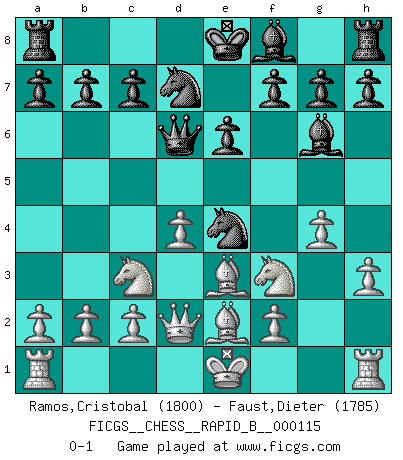 Last move : 0-1 2009 March 31 13:37:36 [Event "FICGS__CHESS__RAPID_B__000115"] [Site "FICGS"] [Date "2009.02.14"] [Round "1"] [White "Ramos,Cristobal"] [Black "Faust,Dieter"] [Result "0-1"] [WhiteElo "1800"] [BlackElo "1785"] 1.e4 d5 2.exd5 Qxd5 3.Nc3 Qd6 4.Nf3 Nf6 5.d4 Bg4 6.Be2 Nbd7 7.Be3 e6 8.h3 Bh5 9.g4 Bg6 10.Qd2 Ne4 0-1 This chess game has been lost on time (started : 2009.02.14 13:9:47) Scandinavian : Pytel-Wade variation Player Black won this chess game. Follow this game move after move (download)Weak points or holes in the opponent's position must be occupied by pieces not Pawns. (Siegbert Tarrasch) Gewinnen beim Schach fördert das Selbstvertrauen. Beim Sex spüre ich sowas nicht... (Garry Kasparov) Tu puedes aprender mucho mas de una partida que pierdas que de una partida ganada. Tendras que perder cientos de partidas antes de llegar a ser un buen jugador. (Jose Raul Capablanca) Mais n'est-ce pas déjà le limiter injurieusement que d'appeler les échecs un jeu? N'est-ce pas aussi une science, un art, ou quelque chose qui, comme le cercueil de Mahomet entre ciel et terre, est suspendu entre l'un et l'autre, et qui réunit un nombre incroyable de contraires ? (Stefan Zweig) I don't diet. I just don't eat as much as I'd like to. (Linda Evangelista, supermodel)