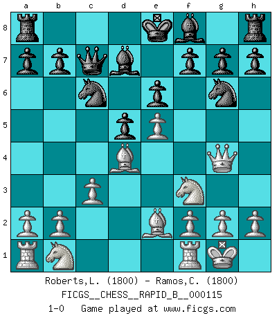 Last move : 1-0 2009 April 18 3:8:20 [Event "FICGS__CHESS__RAPID_B__000115"] [Site "FICGS"] [Date "2009.02.14"] [Round "1"] [White "Roberts,Laurence"] [Black "Ramos,Cristobal"] [Result "1-0"] [WhiteElo "1800"] [BlackElo "1800"] 1.e4 e6 2.d4 d5 3.e5 c5 4.Qg4 Nc6 5.Nf3 Bd7 6.dxc5 Qa5+ 7.Bd2 Qxc5 8.c3 Nge7 9.Be2 Ng6 10.Be3 Qa5 11.O-O Qc7 12.Bd4 1-0 This chess game has been lost on time (started : 2009.02.14 13:9:47) French : Advance, Nimzovich variation Kingside Castling by player White (move 11) Player White won this chess game. Follow this game move after move (download)You know, comrade Pachman, I don't enjoy being a Minister, I would rather play Chess like you. (Che Guevara) Ja, ich habe einmal eine Blitzpartie gespielt, es war in einem Zug, 1929. --im Interview 1989 (Mikhail Moiseyevich Botvinik) Dejen al perfeccionista jugar por correo. (Yasser Seirawan) Que feriez-vous si vous étiez en train de jouer aux échecs et que la fin du monde arrive ? Je continuerais à jouer. (Saint Borromée) If passion drives you, let reason holds the reins. (Benjamin Franklin)