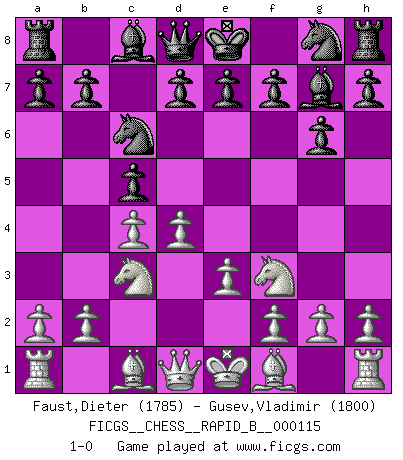 Last move : 1-0 2009 March 24 23:56:36 [Event "FICGS__CHESS__RAPID_B__000115"] [Site "FICGS"] [Date "2009.02.14"] [Round "1"] [White "Faust,Dieter"] [Black "Gusev,Vladimir"] [Result "1-0"] [WhiteElo "1785"] [BlackElo "1800"] 1.c4 c5 2.Nc3 Nc6 3.Nf3 g6 4.e3 Bg7 5.d4 1-0 This chess game has been lost on time (started : 2009.02.14 13:9:47) English : Symmetrical variation Player White won this chess game. Follow this game move after move (download)In the perfect Chess combination as in a first-rate short story, the whole plot and counter-plot should lead up to a striking finale, the interest not being allayed until the very last moment. (Yates and Winter) Ich bin Weltmeister und muß mit niemandem irgend etwas diskutieren. (Viswanathan Anand) Las ideas audaces son como las piezas del Ajedrez que avanzan hacia adelante. Ellas pueden ser vencidas, pero también pueden iniciar una partida victoriosa. (Goethe) RxDa4 pat (...) There is far too much law for those who can afford it and far too little for those who cannot. (Derek Bok)