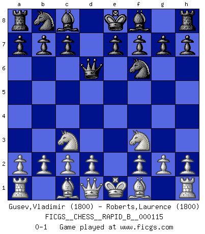 Last move : 0-1 2009 March 23 11:45:54 [Event "FICGS__CHESS__RAPID_B__000115"] [Site "FICGS"] [Date "2009.02.14"] [Round "1"] [White "Gusev,Vladimir"] [Black "Roberts,Laurence"] [Result "0-1"] [WhiteElo "1800"] [BlackElo "1800"] 1.e4 d5 2.exd5 Qxd5 3.Nc3 Qd6 4.Nf3 Nf6 0-1 This chess game has been lost on time (started : 2009.02.14 13:9:47) Scandinavian : Pytel-Wade variation Player Black won this chess game. Follow this game move after move (download)With or without the title, Bobby Fischer was unquestionably the greatest player of his time. (Burt Hochberg) Schach ist eine Sache der genauen Beurteilung, wann man zuschlagen und wann man sich ducken muss. (Robert James Fischer) Aún deseo matar a Fischer. (Boris Spassky) Pour se monter efficace, un Cavalier a besoin d'avant-postes ! Les Cavaliers font les meilleurs bloqueurs de pions passés. The real voyage of discovery consists not in seeking new lands but in seeing with new eyes. (Marcel Proust)