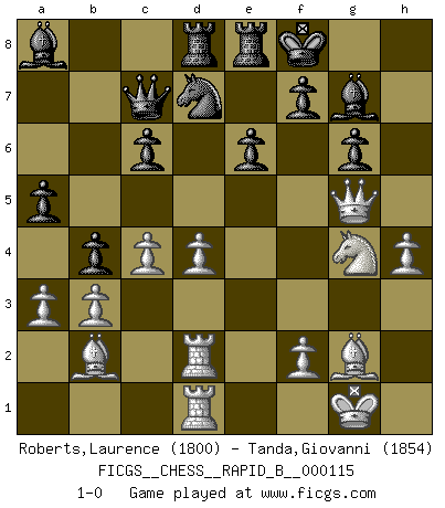 Last move : 1-0 2009 June 1 17:43:40 [Event "FICGS__CHESS__RAPID_B__000115"] [Site "FICGS"] [Date "2009.02.14"] [Round "1"] [White "Roberts,Laurence"] [Black "Tanda,Giovanni"] [Result "1-0"] [WhiteElo "1800"] [BlackElo "1854"] 1.e4 d5 2.exd5 Qxd5 3.Nc3 Qa5 4.g3 Nf6 5.Bg2 c6 6.Nf3 g6 7.O-O Bg7 8.d4 O-O 9.Bd2 Re8 10.Re1 Bg4 11.Ne4 Qb6 12.Bc3 Nbd7 13.h3 Nxe4 14.Rxe4 Bf5 15.Re2 Nf6 16.b3 Rad8 17.Qe1 Qc7 18.Bb2 Bc8 19.Rd1 b6 20.c4 Bb7 21.Bc3 e6 22.Red2 Nd7 23.Qe3 a5 24.h4 b5 25.Ne5 b4 26.Bb2 Ba8 27.Ng4 h5 28.Nh6+ Kf8 29.a3 Bf6 30.g4 hxg4 31.Nxg4 Bg7 32.Qg5 1-0 Scandinavian (centre counter) defense Kingside Castling by player White (move 7) Kingside Castling by player Black (move 8) Player White won this chess game. Follow this game move after move (download)Chess is above all, a fight ! (Emanuel Lasker) Schachspieler können ausgezeichnet Varianten am Schachbrett berechnen, aber nicht im realen Leben. Zu stark ist der Individualismus im Schach ausgeprägt, und für viele ist ein kleiner momentaner persönlicher Vorteil wichtiger als ein weit größerer Vorteil von morgen. (Anatoly Karpov) Antes de los Finales, los dioses han colocado el Juego Medio. (Siegbert Tarrasch) Donnez-moi un Cavalier en 6e et je gagnerais toutes mes parties. (Steinitz) A generalist learns less and less about more and more until he knows nothing about everything. (Author unknown)
