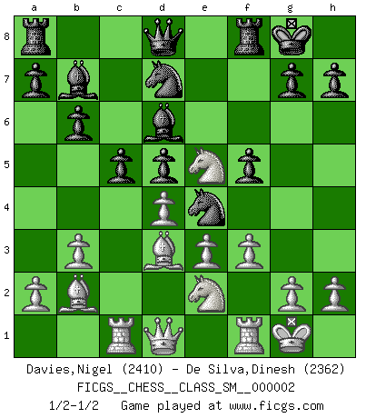 Last move : 1/2-1/2 2006 December 1 7:0:5 [Event "FICGS__CHESS__CLASS_SM__000002"] [Site "FICGS"] [Date "2006.09.01"] [Round "1"] [White "Davies,Nigel"] [Black "De Silva,Dinesh"] [Result "1/2-1/2"] [WhiteElo "2410"] [BlackElo "2362"] 1.d4 Nf6 2.c4 e6 3.Nf3 b6 4.e3 Bb7 5.Bd3 d5 6.cxd5 exd5 7.Nc3 Nbd7 8.O-O Be7 9.b3 O-O 10.Bb2 Ne4 11.Rc1 f5 12.Ne2 Bd6 13.Ne5 c5 14.f3 1/2-1/2 Queen's Indian : 4.e3 Kingside Castling by player White (move 8) Kingside Castling by player Black (move 9) This chess game ended in a draw. Follow this game move after move (download)Blessed be the memory of him who gave the world this immortal game. (A. G. Gardiner) Ich verstehe den Grund nicht, warum die Aufteilung in Frauen und Männer überhaupt im Schach besteht. (Judith Polgar) Los asuntos humanos son como una partida de Ajedrez: solo aquellos que no lo toman seriamente, pueden ser llamados buenos jugadores. (Hung Tzu Ch'eng) Mon pion favori sur ma case favorite ! Bronstein en parlant d'un coup de pion en h5 quand il avait les Noirs. When I took office, only high energy physicists had ever heard of what is called the World Wide Web... Now even my cat has its own page. (Bill Clinton, 1996)