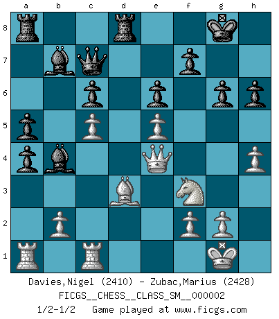 Last move : 1/2-1/2 2006 November 25 1:25:22 [Event "FICGS__CHESS__CLASS_SM__000002"] [Site "FICGS"] [Date "2006.09.01"] [Round "1"] [White "Davies,Nigel"] [Black "Zubac,Marius"] [Result "1/2-1/2"] [WhiteElo "2410"] [BlackElo "2428"] 1.d4 d5 2.c4 e6 3.Nf3 c6 4.Qc2 dxc4 5.Qxc4 Nf6 6.Bg5 b5 7.Qc2 Bb7 8.e4 Nbd7 9.Nbd2 Qb6 10.a4 Bb4 11.Bd3 h6 12.Bxf6 Nxf6 13.O-O Nd7 14.Rfc1 O-O 15.Nb3 bxa4 16.Nc5 Nxc5 17.dxc5 Qc7 18.e5 Rfd8 19.Qe2 a5 20.Qe4 g6 21.h4 1/2-1/2 Queen's gambit declined Kingside Castling by player White (move 13) Kingside Castling by player Black (move 14) This chess game ended in a draw. Follow this game move after move (download)I am the best player in the world and I am here to prove it. (Bobby Fischer) Das ganze Leben mit einer Ehefrau ist wie ein Endspiel mit ungleichfarbigen Läufern. (Viktor Kortschnoi) Tu no necesitas jugar muy bien, únicamente ayudar a tu oponenet a que juegue muy mal. (Genrikh Chepukaitis) Une platitude souvent récitée à propos des Echecs est qu'une des choses les plus difficiles à réaliser est de gagner une position gagnante. Cela ne manque pas de sens mais, pour ma part, j'ai toujours trouvé plus difficile de gagner une position perdante. (Tim Krabbe) For a mechanic, you seem to do an excessive amount of thinking. (C-3PO in Star Wars ep.2)