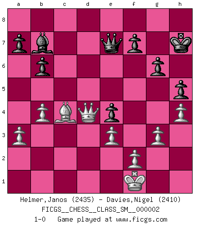 Last move : 1-0 2007 March 11 9:53:49 [Event "FICGS__CHESS__CLASS_SM__000002"] [Site "FICGS"] [Date "2006.09.01"] [Round "1"] [White "Helmer,Janos"] [Black "Davies,Nigel"] [Result "1-0"] [WhiteElo "2435"] [BlackElo "2410"] 1.c4 e6 2.Nc3 d5 3.d4 Nf6 4.Bg5 Be7 5.e3 h6 6.Bh4 O-O 7.Nf3 b6 8.Be2 Nbd7 9.cxd5 exd5 10.O-O Bb7 11.Qb3 c5 12.Bxf6 Nxf6 13.dxc5 Bxc5 14.Rfd1 Qe7 15.Nd4 Rfd8 16.Bf3 Ne4 17.Rac1 Rac8 18.Bg4 Bxd4 19.Rxd4 Qh4 20.Rxe4 Rxc3 21.Qxc3 dxe4 22.h3 h5 23.Be2 Qg5 24.Rd1 Rxd1+ 25.Bxd1 Qd5 26.Bb3 Qd6 27.h4 Kf8 28.Qc4 Qd7 29.Qb4+ Kg8 30.Qd4 Qe7 31.g3 Bc6 32.a3 g6 33.Bc4 Kh7 34.b4 Bb7 35.Kf1 1-0 English Opening Kingside Castling by player Black (move 6) Kingside Castling by player White (move 10) Player White won this chess game. Follow this game move after move (download)What is the object of playing a gambit opening?... To acquire a reputation of being a dashing player at the cost of losing a game. (Siegbert Tarrasch) Es liegt in der Natur, vernüftig zu denken und unlogisch zu handeln. (Anatole France) El Ajedrez es un invernadero donde los frutos del carácter pueden madurar mas completamente que en la vida. (Edward Morgan Foster) La tactique est l'élément le plus important du milieu de jeu. (Siegbert Tarrasch) Kids, you tried your best and you failed miserably. The lesson is, never try. (Simpsons)