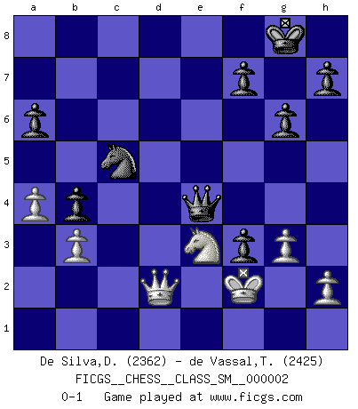 Last move : 0-1 2007 August 26 17:43:8 [Event "FICGS__CHESS__CLASS_SM__000002"] [Site "FICGS"] [Date "2006.09.01"] [Round "1"] [White "De Silva,Dinesh"] [Black "de Vassal,Thibault"] [Result "0-1"] [WhiteElo "2362"] [BlackElo "2425"] 1.d4 d5 2.c4 c6 3.Nf3 Nf6 4.Nc3 e6 5.e3 Nbd7 6.Bd3 dxc4 7.Bxc4 b5 8.Be2 a6 9.O-O c5 10.b3 Bb7 11.Bb2 Bd6 12.dxc5 Bxc5 13.Rc1 O-O 14.a4 b4 15.Nb1 Qe7 16.Nbd2 Rfd8 17.Qc2 Rac8 18.Nc4 Ba7 19.Nfd2 Bb8 20.Bf3 Nd5 21.Qb1 Nc5 22.g3 e5 23.Bg4 Ne6 24.Rfd1 g6 25.e4 Nf6 26.Bh3 Ba7 27.Rf1 Rxc4 28.Nxc4 Bxe4 29.Rc2 Ng5 30.Bg2 Bxg2 31.Kxg2 Qb7+ 32.f3 e4 33.Rd1 exf3+ 34.Kf1 Nd5 35.Bd4 Bxd4 36.Rxd4 Ne3+ 37.Nxe3 Rxd4 38.Qb2 Qe4 39.Rd2 Ne6 40.Kf2 Rxd2+ 41.Qxd2 Nc5 0-1 This chess game has been lost on time (started : 2006.09.01 13:8:28) QGD Slav : 4.Nc3 Kingside Castling by player White (move 9) Kingside Castling by player Black (move 13) Player Black won this chess game. Follow this game move after move (download)A thorough understanding of the typical mating continuations makes the most complicated sacrificial combinations leading up to them not only not difficult, but almost a matter of course. (Siegbert Tarrasch) Der Partner hat auch seine Existenzberechtigung. (Savielly Grigorievitsch Tartakower) El Ajedrez es un mar en el cual un mosquito puede beber y un elefante puede bañarse. (Refrán Hindú) Votre seul travail dans les ouvertures est d'obtenir un milieu de partie jouable. (Lajos Portish) The hypothalamus is one of the most important parts of the brain, involved in many kinds of motivation, among other functions. The hypothalamus controls the 'Four Fs: Fighting, Fleeing, Feeding and Mating. (Unknown author)