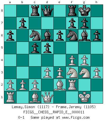 Last move : 0-1 2009 April 3 1:49:23 [Event "FICGS__CHESS__RAPID_E__000011"] [Site "FICGS"] [Date "2009.02.15"] [Round "1"] [White "Lemay,Simon"] [Black "Frame,Jeremy"] [Result "0-1"] [WhiteElo "1117"] [BlackElo "1105"] 1.f4 d5 2.Nf3 Nf6 3.e3 Bf5 4.Be2 c5 5.O-O e6 6.d3 Nc6 7.h3 Bd6 8.g4 Bg6 9.Nbd2 h6 10.Rf2 O-O 11.Nf1 Rc8 12.Ng3 a6 0-1 This chess game has been lost on time (started : 2009.02.15 13:22:49) Bird's Opening Kingside Castling by player White (move 5) Kingside Castling by player Black (move 10) Player Black won this chess game. Follow this game move after move (download)All I want to do, ever, is just play Chess. (Bobby Fischer) Es ist wirklich schade, dass so viele Schachspieler nicht auf ihr Äußeres achten! (Alexandra Kosteniuk) Si un gobernante no entiende al Ajedrez, ¿como puede governar él un reinado?. (El Rey Khusros II) Je crois qu'il existe des manières très spécifiques de jouer efficacement contre une machine. Evidemment, nous n'avons aucune chance en technique pure, parce que l'ordinateur calcule de manière parfaite. Mais lorsque nous faisons appel à notre cerveau, en utilisant l'intuition et la compréhension, alors nous restons beaucoup plus forts. (Anatoli Karpov) Think like a man of action, act like a man of thought. (Henri Louis Bergson)