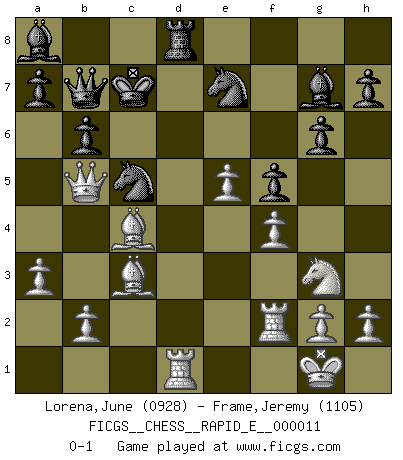 Last move : 0-1 2009 April 28 4:19:43 [Event "FICGS__CHESS__RAPID_E__000011"] [Site "FICGS"] [Date "2009.02.15"] [Round "1"] [White "Lorena,June"] [Black "Frame,Jeremy"] [Result "0-1"] [WhiteElo "0928"] [BlackElo "1105"] 1.d4 d5 2.Nc3 c6 3.e4 e6 4.e5 Nd7 5.f4 Be7 6.Nf3 f6 7.Bd3 f5 8.O-O Nb6 9.Bd2 Nd7 10.Ne2 b6 11.c3 Bb7 12.Rc1 Bf8 13.a3 g6 14.Ng5 Bg7 15.Nxe6 Qe7 16.Nc7+ Kd8 17.Nxa8 Bxa8 18.Qa4 Qe6 19.c4 Ne7 20.cxd5 Qxd5 21.Bc4 Qe4 22.Qb3 c5 23.Rf2 Ng8 24.Ng3 Qb7 25.Rd1 Ne7 26.Bc3 Kc7 27.dxc5 Nxc5 28.Qb5 Rd8 0-1 This chess game has been lost on time (started : 2009.02.15 13:22:49) Queen's pawn : Chigorin variation Kingside Castling by player White (move 8) Player Black won this chess game. Follow this game move after move (download)The passed pawn is a criminal, who should be kept under lock and key. Mild measures, such as police surveillance, are not sufficient. (Nimzovitch) Smyslow ist ein Beweis dafür, dass ich noch zehn Jahre spielen kann! [der 75 jährige über den 85 jährigen] (Viktor Kortschnoi) Un Peón pasado es un criminal, quién debe ser mantenido bajo candado y llave. Leves medidas, tales como vigilancia policiaca, no son suficientes. (Aaron Nimzovich) Mon pion favori sur ma case favorite ! Bronstein en parlant d'un coup de pion en h5 quand il avait les Noirs. Internet: Absolute communication, absolute isolation. (Paul Carvel)