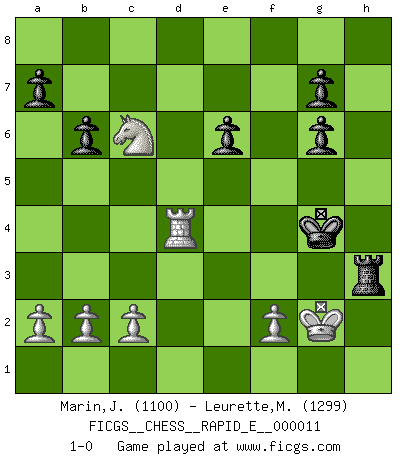 Last move : 1-0 2009 April 23 21:6:17 [Event "FICGS__CHESS__RAPID_E__000011"] [Site "FICGS"] [Date "2009.02.15"] [Round "1"] [White "Marin,John"] [Black "Leurette,Marc-Antoine"] [Result "1-0"] [WhiteElo "1100"] [BlackElo "1299"] 1.e4 e5 2.Nf3 Nc6 3.Bb5 Nf6 4.O-O Nxe4 5.d4 Nd6 6.Bxc6 dxc6 7.dxe5 Nf5 8.Qxd8+ Kxd8 9.Nc3 Ke8 10.h3 b6 11.Rd1 Ba6 12.Bf4 Bc5 13.e6 fxe6 14.Bxc7 Rc8 15.Bh2 Ke7 16.g4 Nd6 17.Na4 Be2 18.Nxc5 Bxd1 19.Rxd1 Rcd8 20.Ne5 Rc8 21.Bf4 Rhf8 22.Ng6+ hxg6 23.Bxd6+ Kf7 24.Bxf8 Rxf8 25.Nd7 Rh8 26.Ne5+ Kf6 27.Nxc6 Rxh3 28.Rd8 Kg5 29.Kg2 Kxg4 30.Rd4+ 1-0 Ruy Lopez : Berlin defense, Open variation Kingside Castling by player White (move 4) Player White won this chess game. Follow this game move after move (download)It is not a move, even the best move that you must seek, but a realizable plan. (Eugene Znosko-Borovsky) Herr Iljumschinow ist ein etwas merkwürdiger Geschäftsmann: Er arbeitet zusammen mit Leuten wie Muammar al-Gaddafi; früher ist das Saddam Hussein gewesen. (Joel Lautier) El Ajedrez por encima de todo... ¡es una pelea!. (Emanuel Lasker) On est toujours la mazette de quelqu'un d'autre. (Anonyme) Everything in life is luck. (Donald Trump)