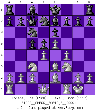 Last move : 1-0 2009 April 4 1:58:43 [Event "FICGS__CHESS__RAPID_E__000011"] [Site "FICGS"] [Date "2009.02.15"] [Round "1"] [White "Lorena,June"] [Black "Lemay,Simon"] [Result "1-0"] [WhiteElo "0928"] [BlackElo "1117"] 1.d4 Nf6 2.Nc3 e6 3.e4 d5 4.e5 Nfd7 5.f4 c5 6.Nf3 Nc6 7.Be3 Qc7 8.Be2 Be7 9.O-O 1-0 This chess game has been lost on time (started : 2009.02.15 13:22:49) Queen's pawn game Kingside Castling by player White (move 9) Player White won this chess game. Follow this game move after move (download)Good offense and good defense both begin with good development. (Bruce A. Moon) Deine Wertungszahl - vorausgesetzt einige Jahre schachliche Anstrengung - entspricht etwa dem zehnfachen Deines IQ plus 1000. (Jonathan Levitt) Siempre es mucho mejor sacrificar las piezas de tu oponente. (Savielly Tartakover) Il n'y a pas de prix trop élevé au scalp de l'ennemi. (Koblentz) He is a liar. I just don't know what the lie is yet. (Horatio Caine, C.S.I. Miami)