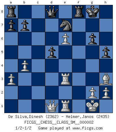 Last move : 1/2-1/2 2007 April 7 16:27:53 [Event "FICGS__CHESS__CLASS_SM__000002"] [Site "FICGS"] [Date "2006.09.01"] [Round "1"] [White "De Silva,Dinesh"] [Black "Helmer,Janos"] [Result "1/2-1/2"] [WhiteElo "2362"] [BlackElo "2435"] 1.d4 Nf6 2.c4 d6 3.Nc3 g6 4.e4 Bg7 5.Nf3 O-O 6.Be2 e5 7.O-O Nc6 8.d5 Ne7 9.b4 Nh5 10.Re1 f5 11.Ng5 Nf4 12.Bxf4 exf4 13.Rc1 Bf6 14.Ne6 Bxe6 15.dxe6 Bxc3 16.Rxc3 fxe4 17.Bg4 h5 18.Bh3 e3 19.fxe3 fxe3 20.Rcxe3 c6 21.a3 d5 22.cxd5 cxd5 1/2-1/2 Old Indian defense Kingside Castling by player Black (move 5) Kingside Castling by player White (move 7) This chess game ended in a draw. Follow this game move after move (download)Chess is a cold bath for the mind. (Sir John Simon) Ein Remis kann durch Wiederholung von drei Zügen oder durch einen schlechte Zug erreicht werden. (Savielly Grigorievitsch Tartakower) Yo tuve un dolor de muelas en la primer partida. En el segundo juego, tuve un dolor de cabeza. En el tercero, tuve un ataque de reumatísmo. En la cuarta partida, no me sentía muy bien. ¿Y en el quinto juego? Bueno, ¿que acaso uno tiene que ganar todos los juegos?. (Siegbert Tarrasch) Les échecs c'est le défi de l'alpiniste, toujours plus haut, prêt à tout pour monter à l'assaut du Roi ennemi. Les échecs, c'est de la musique en mouvement, un ballet majestueux pour les yeux. C'est de la poésie composée par les fantômes du passé qui au même titre que Rimbaud ou Verlaine méritent notre admiration. Les échecs, c'est de la peinture ou le moindre mouvement modifie le tableau pour en faire un Picasso ou un Van Gogh. Les échecs, c'est tout et rien, c'est la vie et la mort. Jjulie33 sur le forum de France-Echecs. Computers are like Old Testament gods; lots of rules and no mercy. (Joseph Campbell)