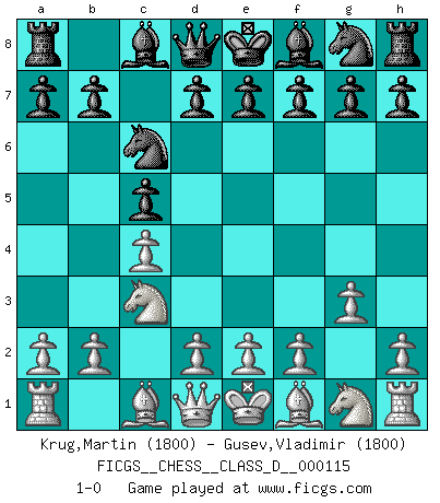 Last move : 1-0 2009 April 3 1:49:23 [Event "FICGS__CHESS__CLASS_D__000115"] [Site "FICGS"] [Date "2009.02.16"] [Round "1"] [White "Krug,Martin"] [Black "Gusev,Vladimir"] [Result "1-0"] [WhiteElo "1800"] [BlackElo "1800"] 1.c4 c5 2.Nc3 Nc6 3.g3 1-0 This chess game has been lost on time (started : 2009.02.16 15:22:19) English : Symmetrical variation Player White won this chess game. Follow this game move after move (download)When you are lonely, when you feel yourself an alien in the world, play Chess. This will raise your spirits and be your counselor in war. (Aristotle) Sie führen leise Selbstgespräche, schlürfen lautstark ihre Getränke, schmatzen hörbar beim Essen, blasen ihrem Gegenüber Rauch in die Augen, niesen ihm ins Gesicht, starren ihn unverwandt an, bis er sich unter ihren Blicken windet, rutschen ständig auf ihrem Stuhl hin und her, rülpsen und bohren in der Nase. (Anonymous) La belleza de un movimiento no se refleja solo en su apariencia, sino en el pensamiento detrás de él. (Siegbert Tarrasch) Les Echecs mettent en conflit, non pas deux intelligences, mais deux volontés. (Lasker) Memory is a crazy woman that hoards colored rags and throws away food. (Austin O'Malley)