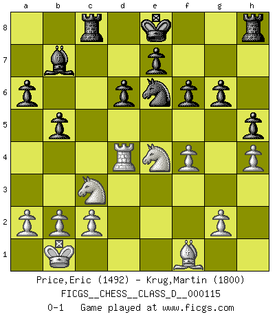 Last move : 0-1 2009 April 30 15:53:24 [Event "FICGS__CHESS__CLASS_D__000115"] [Site "FICGS"] [Date "2009.02.16"] [Round "1"] [White "Price,Eric"] [Black "Krug,Martin"] [Result "0-1"] [WhiteElo "1492"] [BlackElo "1800"] 1.e4 g6 2.d4 d6 3.Nc3 Bg7 4.Be3 a6 5.Qd2 b5 6.f3 Bb7 7.O-O-O Nd7 8.h4 h5 9.Nh3 Rc8 10.Ng5 c5 11.e5 cxd4 12.Bxd4 Bxe5 13.f4 Bxd4 14.Qxd4 Ngf6 15.Rh3 Qb6 16.Qb4 Ng4 17.Re1 Qf2 18.Rd1 Ne3 19.Rxe3 Qxe3+ 20.Kb1 Nc5 21.Qd4 Qxd4 22.Rxd4 f6 23.Nge4 Ne6 0-1 Robatsch (Modern) defense Queenside Castling by player White (move 7) Player Black won this chess game. Follow this game move after move (download)I prefer to lose a really good game than to win a bad one. (David Levy) Die Partien sind immer verschieden, die Interviews immer die gleichen. (Garry Kasparov) El Ajedrez es un cuento de Hadas de las 1001 metidas de pata. (Savielly Tartakower) Si je n'étais pas joueur d'échecs, je serais le meilleur dans quelque chose d'autre. (Anatoli Karpov) The Internet is the first thing that humanity has build that humanity doesn't understand, the largest experiment in anarchy that we have ever had. (Eric Schmidt)