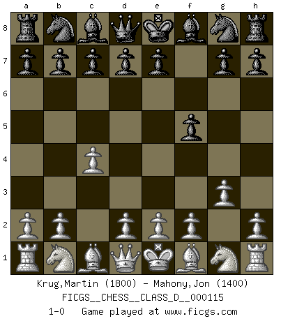 Last move : 1-0 2009 April 2 1:45:28 [Event "FICGS__CHESS__CLASS_D__000115"] [Site "FICGS"] [Date "2009.02.16"] [Round "1"] [White "Krug,Martin"] [Black "Mahony,Jon"] [Result "1-0"] [WhiteElo "1800"] [BlackElo "1400"] 1.c4 f5 2.g3 1-0 This chess game has been lost on time (started : 2009.02.16 15:22:19) English : Anglo-Dutch defense Player White won this chess game. Follow this game move after move (download)Chess mastery essentially consists of analyzing Chess positions accurately. (Mikhail Botvinnik) Ich habe die besten Aussichten, den ersten Preis zu gewinnen - denn jeder muss gegen Steinitz spielen, nur ich nicht! (Wilhelm Steinitz) Aquel que toma al Peón de Caballo de la Reina, se pasará la noche a dormir en la calle. (Anónimo) L'attaque fait le spectacle, la défense gagne les matchs. (Dicton footballistique) Hold em is to stud what chess is to checkers. (Johnny Moss)