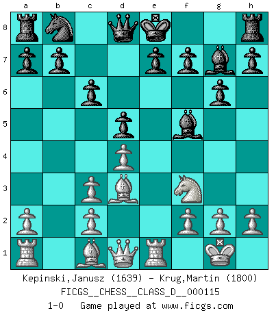 Last move : 1-0 2009 April 8 14:18:6 [Event "FICGS__CHESS__CLASS_D__000115"] [Site "FICGS"] [Date "2009.02.16"] [Round "1"] [White "Kepinski,Janusz"] [Black "Krug,Martin"] [Result "1-0"] [WhiteElo "1639"] [BlackElo "1800"] 1.d4 g6 2.e4 d6 3.Nf3 Bg7 4.Be2 Nf6 5.O-O Nxe4 6.Bb5+ c6 7.Bd3 d5 8.Nc3 Bf5 9.Re1 Nxc3 10.bxc3 1-0 This chess game has been lost on time (started : 2009.02.16 15:22:19) Modern defense Kingside Castling by player White (move 5) Player White won this chess game. Follow this game move after move (download)Fischer prefers to enter Chess history alone. (Miguel Najdorf) Sicherlich können nur Meister einen Stil haben. Daß ein nicht-Meister auch nur ein einziges Mal in seinem Leben eine Partie folgerecht durchführte, habe ich niemals bemerkt. (Emanuel Lasker) Personalmente, yo prefiero mirar hacia el futuro en donde un programa de computadora gane el título mundial de Ajedrez. La humanidad necesita una lección de humildad. (Richard Dawkings) On est toujours la mazette de quelqu'un d'autre. (Anonyme) Luck has a peculiar habit of favoring those who don't depend on it. (Author unknown)