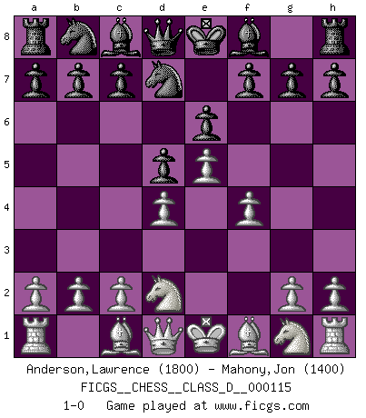 Last move : 1-0 2009 March 31 1:37:23 [Event "FICGS__CHESS__CLASS_D__000115"] [Site "FICGS"] [Date "2009.02.16"] [Round "1"] [White "Anderson,Lawrence"] [Black "Mahony,Jon"] [Result "1-0"] [WhiteElo "1800"] [BlackElo "1400"] 1.e4 e6 2.d4 d5 3.Nd2 Nf6 4.e5 Nfd7 5.f4 1-0 This chess game has been lost on time (started : 2009.02.16 15:22:19) French : Tarrasch, Closed variation Player White won this chess game. Follow this game move after move (download)During a Chess competition a Chessmaster should be a combination of a beast of prey and a monk. (Alexander Alekhine) Ich verachte Kasparow. (Viktor Kortschnoi) Con o sin el título, Bobby Fischer fue sin lugar a dudas el mas grande jugador de su época. (Burt Hochberg) Le génie consiste à savoir transgresser les règles au moment opportun. (Teichmann) Once you start thinking you have nothing left to learn, you have everything to learn. (Steve Badget)
