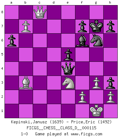 Last move : 1-0 2009 June 25 0:13:44 [Event "FICGS__CHESS__CLASS_D__000115"] [Site "FICGS"] [Date "2009.02.16"] [Round "1"] [White "Kepinski,Janusz"] [Black "Price,Eric"] [Result "1-0"] [WhiteElo "1639"] [BlackElo "1492"] 1.e4 e6 2.d4 d5 3.e5 c5 4.c3 Nc6 5.Be2 Bd7 6.a3 Qb6 7.Nf3 Nh6 8.Bxh6 gxh6 9.b4 cxd4 10.Nxd4 Nxe5 11.a4 a5 12.b5 Bg7 13.O-O O-O 14.Nd2 Rac8 15.Rc1 Ng6 16.N2f3 e5 17.Nb3 Be6 18.Re1 Rfd8 19.Qd2 d4 20.c4 d3 21.c5 Qa7 22.Bd1 Bxb3 23.Bxb3 Rxc5 24.Rxc5 Qxc5 25.Qxa5 Bf6 26.g3 Qd6 27.Qd2 Qa3 28.Qc3 Qd6 29.Qc4 Rd7 30.Rd1 Rc7 31.Rxd3 Qe7 32.Qe4 Kg7 33.Ne1 h5 34.a5 h4 35.Nc2 h3 36.b6 Rc8 37.Qf5 Rd8 38.Rxd8 Qxd8 39.Ne3 Qd2 40.a6 bxa6 41.b7 Qe1+ 42.Nf1 Qb4 43.Qc8 Qe4 44.Ne3 1-0 French : Advance variation Kingside Castling by player White (move 13) Kingside Castling by player Black (move 13) Player White won this chess game. Follow this game move after move (download)The passed Pawn is a criminal, who should be kept under lock and key. Mild measures, such as police surveillance, are not sufficient. (Aaron Nimzovich) Ein Remis kann durch Wiederholung von drei Zügen oder durch einen schlechte Zug erreicht werden. (Savielly Grigorievitsch Tartakower) El estómago es una parte esencial del maestro de Ajedrez. (Bent Larsen) Il vaut mieux sacrifier les pièces de l'adversaire. (Xavier Tartacover) It's only after you lost everything, Tyler says, that you're free to do anything. (Chuck Palahniuk, Fight Club)