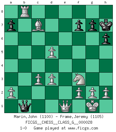 Last move : 1-0 2009 April 24 16:50:50 [Event "FICGS__CHESS__CLASS_G__000028"] [Site "FICGS"] [Date "2009.02.16"] [Round "1"] [White "Marin,John"] [Black "Frame,Jeremy"] [Result "1-0"] [WhiteElo "1100"] [BlackElo "1105"] 1.e4 e5 2.Nf3 Nf6 3.Nxe5 d6 4.Nf3 Nxe4 5.d4 d5 6.Bd3 Bf5 7.O-O Be7 8.Re1 O-O 9.Nc3 Nxc3 10.bxc3 Bg6 11.Rb1 Nc6 12.Rxb7 Bxd3 13.cxd3 Qc8 14.Rb5 Rb8 15.Rxd5 Qb7 16.Bf4 Rfe8 17.Rd7 Bd6 18.Bxd6 Rxe1+ 19.Qxe1 h6 20.d5 Nd8 21.Bxc7 Qb1 22.Rxd8+ Kh7 23.Rxb8 1-0 Petrov : Classical attack Kingside Castling by player White (move 7) Kingside Castling by player Black (move 8) Player White won this chess game. Follow this game move after move (download)You can only get good at Chess if you love the game. (Bobby Fischer) Schach ist ein Reich, wo sich die menschliche Phantasie frei entfalten kann. (David Bronstein) No todos los artistas son jugadores de Ajedrez, pero todos los jugadores de Ajedrez son artistas. (Marcel Duchamp) Les échecs sont un jeu terrible. Si vous n'avez pas le centre, votre adversaire a une position plus libre. Par contre, si vous avez le centre, alors vous avez vraiment quelque chose pour laquelle vous inquiéter ! (Siegbert Tarrasch) Tree pose grows confidence. It roots me to this world. (Terri Guillemets)