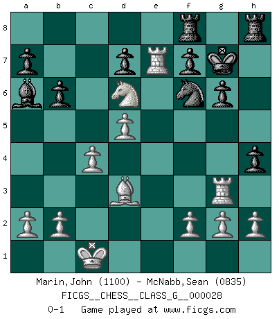 Last move : 0-1 2009 July 6 22:1:36 [Event "FICGS__CHESS__CLASS_G__000028"] [Site "FICGS"] [Date "2009.02.16"] [Round "1"] [White "Marin,John"] [Black "McNabb,Sean"] [Result "0-1"] [WhiteElo "1100"] [BlackElo "0835"] 1.e4 c5 2.Nf3 Nc6 3.d4 e6 4.d5 exd5 5.exd5 Nd4 6.Nxd4 cxd4 7.Qxd4 Qe7+ 8.Be3 Nf6 9.Nc3 Qb4 10.O-O-O Qxd4 11.Bxd4 Bd6 12.Re1+ Kf8 13.Bd3 b6 14.Nb5 Bf4+ 15.Be3 Bxe3+ 16.Rxe3 Bb7 17.c4 h5 18.Nd6 Ba6 19.Rhe1 g6 20.Rf3 Kg7 21.Re7 Raf8 22.Rg3 h4 0-1 This chess game has been lost on time (started : 2009.02.16 17:55:58) Sicilian defense Queenside Castling by player White (move 10) Player Black won this chess game. Follow this game move after move (download)Bobby Fischer's current state of mind is indeed a tragedy. One of the world's greatest Chess players - the pride and sorrow of American Chess. (Frank Brady) Ein unbeabsichtigtes Patt ist der Gipfel der Dummheit. (Anonymous) Nunca nadie ha ganado una partida de Ajedrez rindiendose. (Unknown) Nous vivons dans un monde échiquéen : chaque jour qui passe est un défi à relever. (Philosophe Sasha) Art is the only way to run away without leaving home. (Twyla Tharp)