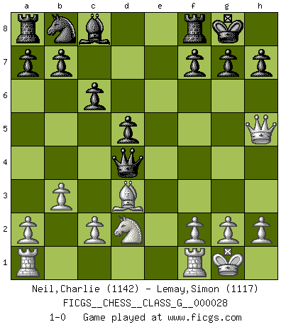 Last move : 1-0 2009 May 15 6:4:23 [Event "FICGS__CHESS__CLASS_G__000028"] [Site "FICGS"] [Date "2009.02.16"] [Round "1"] [White "Neil,Charlie"] [Black "Lemay,Simon"] [Result "1-0"] [WhiteElo "1142"] [BlackElo "1117"] 1.e4 e6 2.d4 d5 3.exd5 exd5 4.Bd3 Nf6 5.Bg5 Be7 6.Ne2 O-O 7.O-O c6 8.Bxf6 Bxf6 9.Nd2 Qb6 10.b3 Bxd4 11.Nxd4 Qxd4 12.Qh5 1-0 This chess game has been lost on time (started : 2009.02.16 17:55:58) French : Exchange variation Kingside Castling by player Black (move 6) Kingside Castling by player White (move 7) Player White won this chess game. Follow this game move after move (download)Daring ideas are like Chess men moved forward. They may be beaten, but they may start a winning game. (Johann Wolfgang von Goethe) Taktik ist was man tun muß, wenn etwas zu tun ist. Strategie ist was man tun muß, wenn nichts zu tun ist. (Savielly Grigorievitsch Tartakower) Solo el jugador con la iniciativa tiene el derecho a atacar. (Wilhelm Steinitz) Le génie consiste à savoir transgresser les règles au moment opportun. (Teichmann) There's no money in correspondence chess. (John Knudsen)