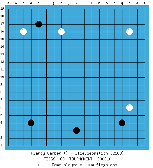 Last move : 0-1 2006 October 10 5:49:31 [Event "FICGS__GO__TOURNAMENT__000010 "] [Site "FICGS"] [Date "2006.09.01"] [Round "1"] [Black "Alakay,Canbek "] [White "Ilie,Sebastian "] [Result "0-1"] [Rating 2 "2100"] 1.d4 c16 2.q4 r16 3.k3 r6 4.e17 h16 0-1 This go game has been lost on time (started : 2006.09.01 16:23:19) Here are the names of the openings (joseki) played in the four corners : Corner q4 : q4 r6Hoshi (Hwajeom, Seongjeom, Xingwei`) 4-4 Point. The star or hoshi (4-4) point, emphasizing influence at the potential expense of territory.Ikken Kakari (Hankan Keolch'im, Yi Gua`jiao~, 1-Space Low Approach). White 2 is the standard approach move to the 4-4. Corner d16 : c16 e17Komoku (Somok, Xiao~mu`) 3-4 Point. The komoku (3-4) point is the traditional corner enclosure move..Ikken Kakari (Hankan Keolch'im, Yi Gua`jiao~, 1-Space Low Pincer). The small knight move is the basic approach move to the 3-4 point stone. It has been continually used for over four centuries. There are limitless variations, with new moves constantly being discovered. Black 2 opens the door to a treaure store of joseki. Player White won this Go (weiqi, baduk) game.Follow this game move after move (download ) Beware of the clumsy double contact. (Anonymous) When a man with money meets a man with experience, the man with experience leaves with money and the man with money leaves with experience. (Anonymous)
