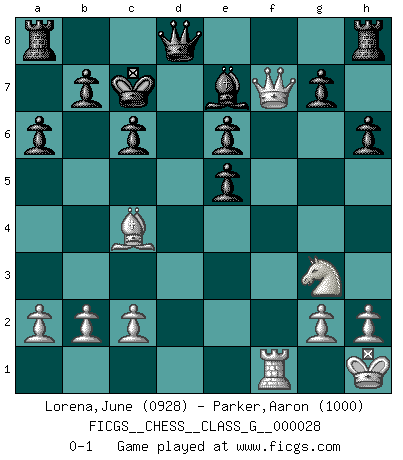 Last move : 0-1 2009 May 22 18:27:2 [Event "FICGS__CHESS__CLASS_G__000028"] [Site "FICGS"] [Date "2009.02.16"] [Round "1"] [White "Lorena,June"] [Black "Parker,Aaron"] [Result "0-1"] [WhiteElo "0928"] [BlackElo "1000"] 1.d4 d5 2.Nc3 Nf6 3.e4 dxe4 4.f3 exf3 5.Nxf3 c6 6.Bd3 Bg4 7.O-O e6 8.Qe1 Bxf3 9.Rxf3 Qxd4+ 10.Kh1 Qd8 11.Qh4 Be7 12.Bg5 Nbd7 13.Raf1 a6 14.Ne4 h6 15.Be3 Nd5 16.Qf2 Nxe3 17.Rxe3 Ne5 18.Ng3 f6 19.Rxe5 fxe5 20.Qf7+ Kd7 21.Bc4 Kc7 0-1 Blackmar-Diemer gambit Kingside Castling by player White (move 7) Player Black won this chess game. Follow this game move after move (download)I won't play with you anymore. You have insulted my friend. - When an opponent cursed himself for a blunder. (Miguel Najdorf) Warum muß ich gegen diesen IDIOTEN verlieren? (Aaron Nimzowitsch) EL Ajedrez es como la vida. (Boris Spassky) Les échecs sont un jeu terrible. Si vous n'avez pas le centre, votre adversaire a une position plus libre. Par contre, si vous avez le centre, alors vous avez vraiment quelque chose pour laquelle vous inquiéter ! (Siegbert Tarrasch) If only people were all showed a certain minimum level of niceness; if only people didn't retract verbal draw offers (without draw box ticked) on ficgs; if only people didn't kill; if only people didn't run concentration / extermination camps, if only people didn't drop nuclear bombs on Hiroshima and Nagasaki, and so on - it would be a much more beautiful world. But sadly, things are not so... (Normajean Yates)