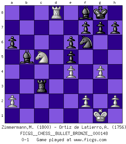 Last move : 0-1 2009 November 7 16:9:40 [Event "FICGS__CHESS__BULLET_BRONZE__000148"] [Site "FICGS"] [Date "2009.11.07"] [Round "1"] [White "Zimmermann,Melchior"] [Black "Ortiz de Latierro,Aitor"] [Result "0-1"] [WhiteElo "1800"] [BlackElo "1756"] 1.e4 c5 2.Nc3 d6 3.Nf3 Nf6 4.d4 cxd4 5.Nxd4 a6 6.Be2 e6 7.O-O Be7 8.Bf3 Nbd7 9.Re1 Qc7 10.Qd3 Ne5 11.Qd1 O-O 12.Bf4 b5 13.Bxe5 dxe5 14.Nb3 Rd8 15.Qe2 b4 16.Na4 Bd7 17.Nac5 Bxc5 18.Rad1 Bb5 19.c4 bxc3 20.Qc2 Rxd1 21.Rxd1 Bf8 22.bxc3 Rc8 23.Rc1 Ba3 24.Rd1 Qxc3 25.Qxc3 Rxc3 26.Rd8+ Bf8 27.g4 Rxf3 28.Nc5 Rc3 0-1 Sicilian : Closed Kingside Castling by player White (move 7) Kingside Castling by player Black (move 11) Player Black won this chess game. Follow this game move after move (download)In the perfect Chess combination as in a first-rate short story, the whole plot and counter-plot should lead up to a striking finale, the interest not being allayed until the very last moment. (Yates and Winter) Es ist nicht das erste mal, dass sich die FIDE dem Arabischen Geld gebeugt hat (über die FIDE WM 2004 in Lybien). (Larry Evans) Los tropiezos estan todos ahí en el tablero, esperando que se cometan. (Savielly Tartakover) Nous vivons dans un monde échiquéen : chaque jour qui passe est un défi à relever. (Philosophe Sasha) Art disturbs, science reassures. (Georges Braque, Le Jour et la Nuit)