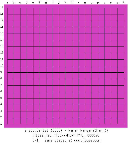 Last move : 0-1 2009 March 20 11:25:23 [Event "FICGS__GO__TOURNAMENT_KYU__000076"] [Site "FICGS"] [Date "2009.02.18"] [Round "1"] [Black "Grecu,Daniel"] [White "Raman,Ranganathan"] [Result "0-1"] [Rating 1 "0000"] 0-1 This go game has been lost on time (started : 2009.02.18 2:46:16) Here are the names of the openings (joseki) played in the four corners : Player White won this Go (weiqi, baduk) game. Follow this game move after move (download)Learning josekis by heart is useless if you don't try departing from them. (Pierre Audouard) I find television to be very educating. Every time somebody turns on the set, I go in the other room and read a book. (Groucho Marx)