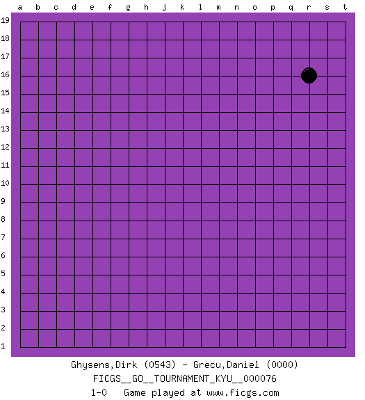 Last move : 1-0 2009 March 20 11:25:23 [Event "FICGS__GO__TOURNAMENT_KYU__000076"] [Site "FICGS"] [Date "2009.02.18"] [Round "1"] [Black "Ghysens,Dirk"] [White "Grecu,Daniel"] [Result "1-0"] [Rating 1 "0543"] [Rating 2 "0000"] 1.r16 1-0 This go game has been lost on time (started : 2009.02.18 2:46:16) Here are the names of the openings (joseki) played in the four corners : Player Black won this Go (weiqi, baduk) game. Follow this game move after move (download)The carpenter's square becomes ko. (Anonymous) Indecision is the key to flexibility. (Unknown)