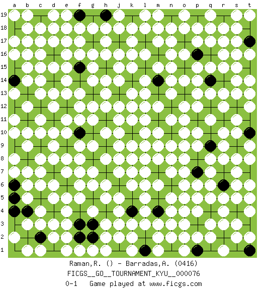 Last move : 0-1 2009 July 4 1:48:45 [Event "FICGS__GO__TOURNAMENT_KYU__000076"] [Site "FICGS"] [Date "2009.02.18"] [Round "1"] [Black "Raman,Ranganathan"] [White "Barradas,Anderson"] [Result "0-1"] [Rating 2 "0416"] 1.k10 k9 2.l10 l9 3.m9 j9 4.h9 j10 5.j8 k8 6.l8 m8 7.m7 l7 8.k7 j7 9.k6 h8 10.l6 l8 11.h7 m10 12.n10 n9 13.m11 m9 14.j6 j8 15.b18 n11 16.l12 o10 17.n12 o11 18.m13 o12 19.p11 p10 20.q10 q11 21.k11 j11 22.j12 h12 23.h11 h10 24.k5 p12 25.o13 p13 26.q12 r12 27.k13 g11 28.g10 g9 29.f10 f9 30.e9 e10 31.f11 d9 32.e8 d10 33.k4 f12 34.g13 e11 35.f10 f8 36.g8 g7 37.h13 e7 38.f6 h6 39.h5 d8 40.e9 e8 41.g5 g6 42.e12 e13 43.d11 d12 44.c12 c11 45.c10 b10 46.c9 c8 47.d7 d6 48.b11 b9 49.j4 f5 50.f4 e5 51.a12 c7 52.g3 e4 53.e3 m6 54.n6 n7 55.o8 n5 56.f14 c13 57.d14 b12 58.h3 l5 59.a10 a11 60.a9 a8 61.m4 l4 62.m5 l3 63.p7 o6 64.p9 n4 65.g15 a13 66.f2 d3 67.d4 d5 68.k3 m3 69.j5 e2 70.f3 d2 71.g4 k2 72.e15 j2 73.h4 h2 74.j1 k1 75.g1 h1 76.f1 e1 77.d1 c1 78.l2 m2 79.l1 m1 80.q8 r10 81.q9 r9 82.r8 s8 83.s7 t8 84.s9 s10 85.t10 t9 86.t11 t12 87.s12 s11 88.s13 r13 89.q14 q13 90.p14 s14 91.t14 t13 92.t15 s15 93.t16 s16 94.t17 s17 95.t18 s18 96.r14 q15 97.r15 r16 98.q16 p15 99.o15 o14 100.n14 n13 101.p16 m12 102.r17 q17 103.q18 r18 104.q19 o16 105.p17 r17 106.o17 n15 107.m14 l11 108.l14 k12 109.j13 l13 110.p18 l12 111.k14 n17 112.n18 m18 113.m19 m17 114.l19 l18 115.k19 k18 116.j19 j18 117.h19 h18 118.g19 g18 119.f19 f18 120.e19 e18 121.d19 d18 122.c19 c18 123.b19 b17 124.a17 a16 125.a18 b16 126.n19 m15 127.d16 c14 128.d15 c15 129.c16 c17 130.d17 l16 131.h16 k17 132.j15 k15 133.l15 k16 134.f16 e17 135.g17 f13 136.a14 b14 137.q6 p5 138.r7 q5 139.s4 r5 140.s6 s5 141.t5 r4 142.t3 s3 143.t4 p6 144.r3 s2 145.r2 r1 146.q1 q3 147.q4 q2 148.p1 o1 149.p2 o2 150.p3 p4 151.o3 n3 152.j17 h14 153.b2 b3 154.c3 c4 155.c2 a2 156.b4 b1 157.a5 b5 158.a6 b6 159.a4 a7 160.t1 t2 161.g14 e16 162.f17 e14 163.f15 h17 164.o19 j16 165.j14 t6 166.t5 t4 167.r6 o7 168.t7 t5 169.r2 r3 170.o4 o5 171.r19 t19 172.r14 r15 173.q14 p14 174.p19 pass 175.p8 o9 176.c2 c3 177.k10 pass 178.p1 p2 179.a15 b15 180.t17 t16 181.t15 t14 182.a19 s19 183.a14 o18 184.o3 n8 185.t10 pass 186.p19 p18 187.h15 n16 188.p16 p17 189.n1 n2 190.b18 b19 191.a18 a17 192.c19 d19 193.n19 o19 194.n18 m19 195.q19 a19 196.d13 g12 197.g2 j3 198.k4 j4 199.j5 h5 200.k6 l6 201.h19 j19 202.h4 g4 203.g3 h3 204.f2 e3 205.f3 f1 206.g2 g1 207.k5 k3 208.f19 e19 209.k19 l19 210.r19 q18 211.a9 a10 212.p19 q19 213.k11 l10 214.g16 h14 215.j13 j14 216.g15 g14 217.f15 f16 218.k14 l14 219.h13 k13 220.f14 g16 221.h15 e15 222.j6 k7 223.p3 o4 224.h16 j15 225.d16 d15 226.d14 d13 227.g13 j12 228.l1 q7 229.p8 q8 230.q9 p9 231.r7 s7 232.r6 s6 233.k5 j5 234.p3 o3 235.k4 k6 236.q6 r8 237.p7 o8 238.c5 c6 239.a18 b18 240.e6 f7 241.n19 n18 242.m14 n14 243.r6 q6 244.f15 g15 245.c16 d17 246.b8 b7 247.k10 k11 248.s12 s13 249.d16 c16 250.g13 h13 251.h15 h16 252.k4 f6 253.m4 f11 254.p7 c10 255.g17 f17 256.q14 pass 257.pass pass 0-1 Here are the names of the openings (joseki) played in the four corners : Corner q4 : l9 m9 This joseki is unknown. A weak or weird move has probably been played in this corner. Corner d4 : j9 h9 This joseki is unknown. A weak or weird move has probably been played in this corner. Corner q16 : m11 n11 This joseki is unknown. A weak or weird move has probably been played in this corner. Corner d16 : b18 j11 This joseki is unknown. A weak or weird move has probably been played in this corner. Player White won this Go (weiqi, baduk) game. Follow this game move after move (download)If your stone is capped, play the knight's move. (Anonymous) When the going gets tactical, the computers get going. (Hyatt)