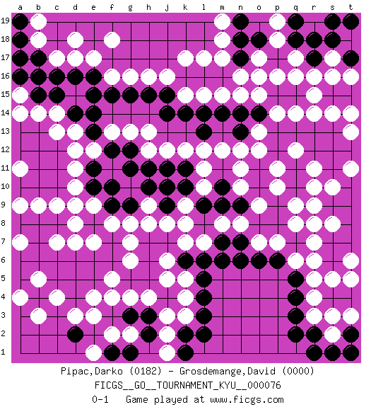 Last move : 0-1 2009 March 3 17:19:54 [Event "FICGS__GO__TOURNAMENT_KYU__000076"] [Site "FICGS"] [Date "2009.02.18"] [Round "1"] [Black "Pipac,Darko"] [White "Grosdemange,David"] [Result "0-1"] [Rating 1 "0182"] [Rating 2 "0000"] 1.d4 q16 2.q4 c17 3.d16 f16 4.c16 d17 5.e16 e17 6.f15 g16 7.g15 h16 8.h15 j16 9.j15 k15 10.k14 l15 11.l14 m15 12.m14 n15 13.n14 o15 14.o14 p14 15.p13 q14 16.q13 r14 17.r13 s14 18.s13 t13 19.t12 t14 20.s12 q8 21.b17 b18 22.b16 r5 23.a18 b19 24.a17 r3 25.a19 d18 26.q5 r4 27.q3 q6 28.p6 p7 29.o6 o7 30.n6 r7 31.q18 q17 32.r18 p18 33.q19 p19 34.s18 s17 35.t17 s16 36.s19 t18 37.t19 o17 38.r17 r16 39.p15 d10 40.k16 k17 41.l16 l17 42.m16 n16 43.n7 k4 44.r2 s2 45.q2 n8 46.s1 t3 47.r1 m8 48.s7 s8 49.s6 r6 50.t7 s5 51.s9 r9 52.t8 s10 53.r8 r10 54.t10 s8 55.t9 n11 56.s11 o12 57.k10 o13 58.p12 p11 59.q11 p10 60.q10 q9 61.n13 n12 62.n17 m17 63.m7 l7 64.l6 k7 65.k6 h4 66.l5 j6 67.l4 j5 68.l3 k3 69.l2 j8 70.k2 j2 71.k1 j1 72.m6 k9 73.t1 l10 74.k11 l11 75.t2 s3 76.e5 d7 77.d6 c7 78.c6 k12 79.j11 j12 80.h11 h12 81.g11 m12 82.g12 h13 83.j14 g13 84.f12 f13 85.e13 e12 86.e11 d12 87.e14 d11 88.e10 e9 89.f9 f8 90.e8 d9 91.f10 g8 92.g9 h9 93.h10 e7 94.f7 g7 95.f6 c13 96.c8 b14 97.b7 c9 98.b8 d8 99.b6 g6 100.e15 c14 101.b15 a15 102.a16 a14 103.c12 b9 104.c11 d13 105.c10 f5 106.e6 f4 107.j9 h8 108.j10 e3 109.l9 k8 110.m9 d3 111.m10 n10 112.n9 o9 113.l13 l12 114.b10 a9 115.a8 c4 116.b4 b3 117.b12 b5 118.c5 a4 119.a10 e4 120.d5 k5 121.b13 r8 122.a13 a11 123.d14 a12 124.b11 a11 125.a12 a11 126.a6 f18 127.c15 r11 128.r12 t5 129.q15 r15 130.p16 t6 131.a5 a7 132.h3 j3 133.g3 g4 134.h2 f2 135.f1 e1 136.g1 g2 137.n18 m18 138.n19 m19 139.p17 t16 140.o18 o16 141.d2 t11 142.p17 p16 143.pass pass 144.pass q12 0-1 Here are the names of the openings (joseki) played in the four corners : Corner d16 : c17 d16 San-San (Sam-Sam, San-San) 3-3 Point. The San-San (3-3) point, emphasizing territory at the expense of influence. Kata-tsuki (shoulder hit). The shoulder-hit is the traditional answer to the 3-3. The direction of White 3 depends on the positions on the side. Crawling once may be the premise for a follow-up move of sliding with a knight's move in the opposite direction. If White plays 3 at 3-4 (to the right), the follow-on knight's move is then played at the top (e.g. 3-4, 4-5, 5-2). White's knight's move reduces territory potential on the side it is played. Corner q4 : q4 q8 Hoshi (Hwajeom, Seongjeom, Xingwei`) 4-4 Point. The star or hoshi (4-4) point, emphasizing influence at the potential expense of territory. Corner d4 : d4 h4 Hoshi (Hwajeom, Seongjeom, Xingwei`) 4-4 Point. The star or hoshi (4-4) point, emphasizing influence at the potential expense of territory. Player White won this Go (weiqi, baduk) game. Follow this game move after move (download)One point in the center is worth ten in the corner. (Anonymous) Go and wake up your luck. (Persian saying)