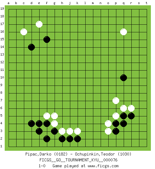 Last move : 1-0 2009 April 7 2:13:56 [Event "FICGS__GO__TOURNAMENT_KYU__000076"] [Site "FICGS"] [Date "2009.02.18"] [Round "1"] [Black "Pipac,Darko"] [White "Ochupinkin,Teodor"] [Result "1-0"] [Rating 1 "0182"] [Rating 2 "1030"] 1.d4 q16 2.q4 c16 3.d14 e17 4.f15 f3 5.f4 g4 6.e3 f5 7.e4 g5 8.f2 o3 9.g3 h3 10.h2 j3 11.j2 k3 12.k2 r6 13.q10 p5 14.q5 q6 15.r5 p7 16.p4 o4 17.p3 1-0 This go game has been lost on time (started : 2009.02.18 2:46:16) Here are the names of the openings (joseki) played in the four corners : Corner d16 : c16 d14 Komoku (Somok, Xiao~mu`) 3-4 Point. The komoku (3-4) point is the traditional corner enclosure move.. Corner d4 : d4 f3 Hoshi (Hwajeom, Seongjeom, Xingwei`) 4-4 Point. The star or hoshi (4-4) point, emphasizing influence at the potential expense of territory. Ikken Kakari (Hankan Keolch'im, Yi Gua`jiao~, 1-Space Low Approach). White 2 is the standard approach move to the 4-4. Corner q4 : q4 o3 Hoshi (Hwajeom, Seongjeom, Xingwei`) 4-4 Point. The star or hoshi (4-4) point, emphasizing influence at the potential expense of territory. Ikken Kakari (Hankan Keolch'im, Yi Gua`jiao~, 1-Space Low Approach). White 2 is the standard approach move to the 4-4. Player Black won this Go (weiqi, baduk) game. Follow this game move after move (download)Ikken tobi is never wrong. (Anonymous) Unless in communicating with it one says exactly what one means, trouble is bound to result. (Alan Turing, about computers)