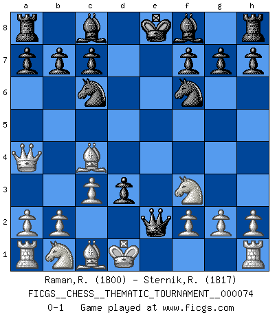 Last move : 0-1 2009 March 30 13:34:32 [Event "FICGS__CHESS__THEMATIC_TOURNAMENT__000074"] [Site "FICGS"] [Date "2009.02.18"] [Round "1"] [White "Raman,Ranganathan"] [Black "Sternik,Ryszard"] [Result "0-1"] [WhiteElo "1800"] [BlackElo "1817"] 1.e4 d5 2.Qf3 dxe4 3.Qxe4 Nf6 4.Qa4+ Nc6 5.c3 e5 6.Bc4 e4 7.d4 exd3 8.Nf3 Qe7+ 9.Kd1 Qe2+ 0-1 This chess game has been lost on time (started : 2009.02.18 3:43:7) Scandinavian (centre counter) defense Player Black won this chess game. Follow this game move after move (download)Methodical thinking is of more use in Chess than inspiration. (C. J. S. Purdy) Schon mancher Spieler hat aufgegeben, um zu vermeiden, daß er eine Figur verliert. (Savielly Grigorievitsch Tartakower) El jugador táctico sabe que hacer cuando hay algo que hacer; mientras que el estratega sabe que hacer cuando no hay nada que hacer. (Gerald Abrahams) 'L'échange des dames est un coup dur pour les deux adversaires...' Un journaliste lors d'une partie du match Spassky-Fischer Now you put water in a cup, it becomes the cup; You put water into a bottle it becomes the bottle; You put it in a teapot it becomes the teapot. Water can flow or it can crash. Be water, my friend. (Bruce Lee)