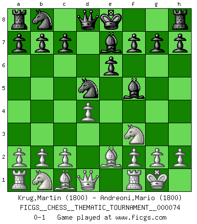 Last move : 0-1 2009 April 7 14:14:37 [Event "FICGS__CHESS__THEMATIC_TOURNAMENT__000074"] [Site "FICGS"] [Date "2009.02.18"] [Round "1"] [White "Krug,Martin"] [Black "Andreoni,Mario"] [Result "0-1"] [WhiteElo "1800"] [BlackElo "1800"] 1.e4 d5 2.exd5 Nf6 3.d4 Nxd5 4.Be2 Bf5 5.Nf3 e6 6.O-O Be7 0-1 This chess game has been lost on time (started : 2009.02.18 3:43:7) Scandinavian : Marshall variation Kingside Castling by player White (move 6) Player Black won this chess game. Follow this game move after move (download)Of Chess it has been said that life is not long enough for it, but that is the fault of life, not Chess. (William Ewart Napier) Konzentriere dich auf materielle Gewinne. Nimm, was dir dein Gegner gibt, ausser es gibt einen guten Grund der dagegenspricht. (Robert James Fischer) Estaba muy claro de que el punto vulnerable del Gran Maestro Americano (Bobby Fischer) radicaba en las posiciones de doble filo, colgantes, irracionales, donde el siempre falló en encontrar un triunfo aún en una posición de clara victoria. (Efim Geller) Vous savez, camarade Pachman, je n'éprouve pas de plaisir à être ministre, je jouerais plutôt aux échecs comme vous, ou alors ferais une révolution au Venezuela. (Che Guevara à Ludek Pachman, 'Checkmate in Prague', 1975) When I took office, only high energy physicists had ever heard of what is called the World Wide Web... Now even my cat has its own page. (Bill Clinton, 1996)